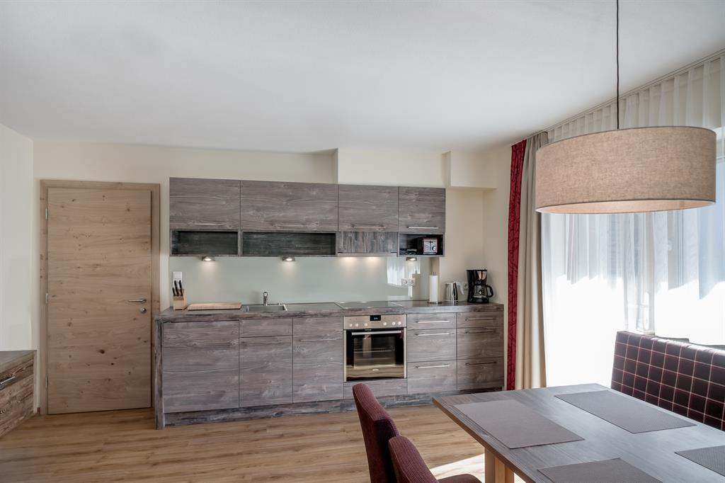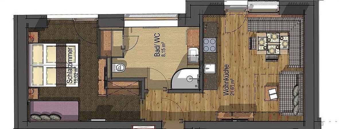 Hochwertig eingerichtetes Appartement im Untergeschoss mit ca. 48 m², Vorraum mit Garderobe, Doppelzimmer mit Boxspringbetten und Sofa (Liegefläche 80x200), Badezimmer mit WC und Regendusche, Föhn, Infrarotkabine, Flat-TV, Wohnküche mit Essecke und voll ausgestatteter Küchenzeile (Backrohr, Ceranfeld mit 4 Platten, Spülmaschine, Kühlschrank mit Gefrierfach, Wasserkocher, Geschirr), Safe, Terrasse.