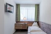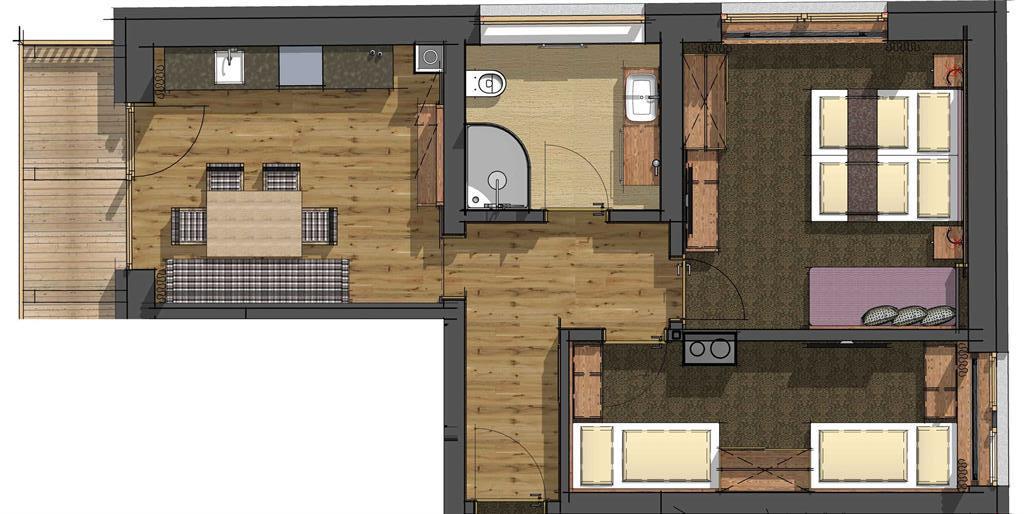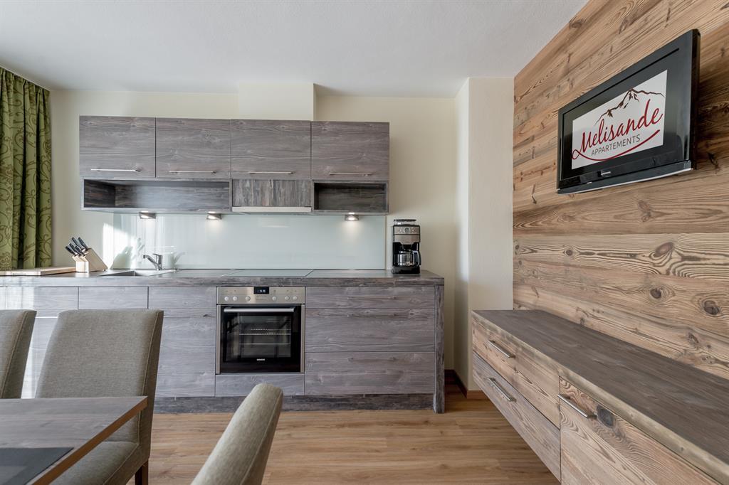 Hochwertig eingerichtetes Appartement im 1. Stock mit ca. 54 m², 1 Doppelzimmer mit Boxspringbetten u. Sofa (Liegefläche 80x200), Flat-TV, 1 Zweibettzimmer mit Flat-TV, Wohnküche mit Essecke und voll ausgestatteter Küchenzeile (Backrohr, Ceranfeld mit 4 Platten, Spülmaschine, Kühlschrank mit Gefrierfach, Wasserkocher, Geschirr), Flat-TV, Badezimmer mit WC und Regenwalddusche; Südbalkon.