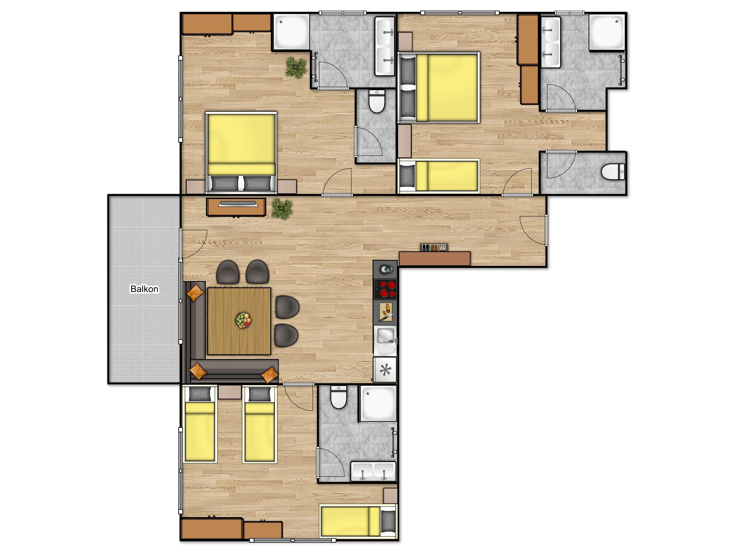 Ausgestattet mit Küchen-Wohnbereich, 3 Schlafzimmer, 3x Bad mit Dusche, 3x WC, Flat-TV, Wifi Internet und westseitigem Balkon.