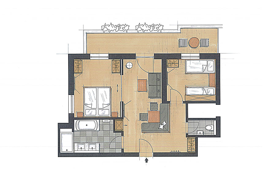 Gemütlicher Wohnschlafraum und separates Kinderzimmer mit Einzel- und Stockbett, WLAN, Telefon mit integrierter Babyphonanlage, Safe, TV mit Sky, Badezimmer mit Doppelwaschbecken, Dusche und Badewanne, Kosmetikspiegel, Fön, separates WC, Kühlschrank, Wasserkocher, Mikrowelle und Balkon
