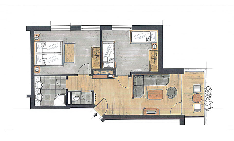 Elternschlafzimmer, Kinderzimmer mit Einzel- und Stockbett, seperater Wohnraum, WLAN, Telefon mit integrierter Babyphonanlage, Safe, TV mit Sky, Badezimmer mit Doppelwaschbecken, Dusche, Kosmetikspiegel, Fön, separates WC, Kühlschrank, Wasserkocher, Mikrowelle, Balkon