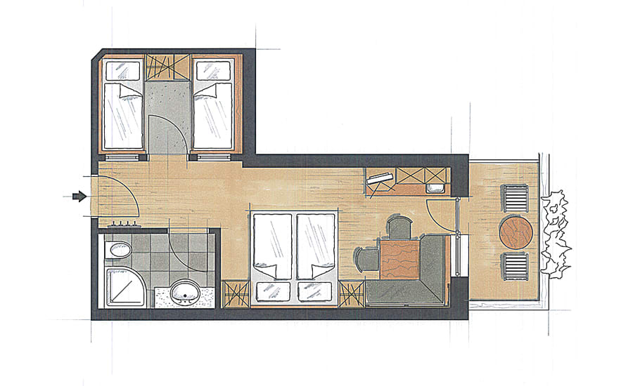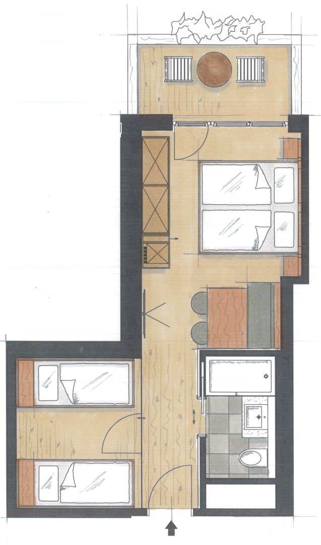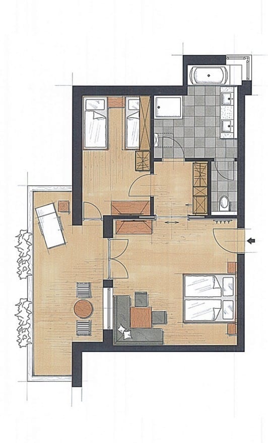 Wohnschlafraum und getrenntes Kinderzimmer mit zwei Einzelbetten WLAN, Telefon mit integrierter Babyphonanlage, Safe, TV mit Sky Badezimmer mit Dusche, Kosmetikspiegel, Fön, WC, Kühlschrank, Wasserkocher und Balkon