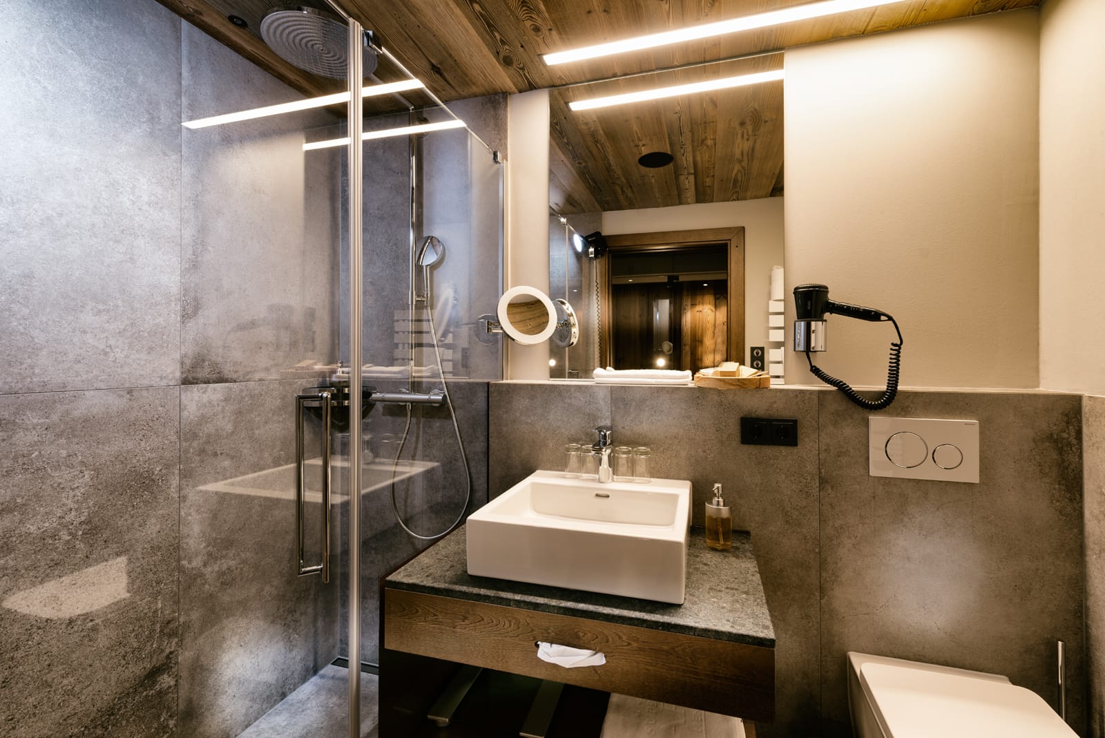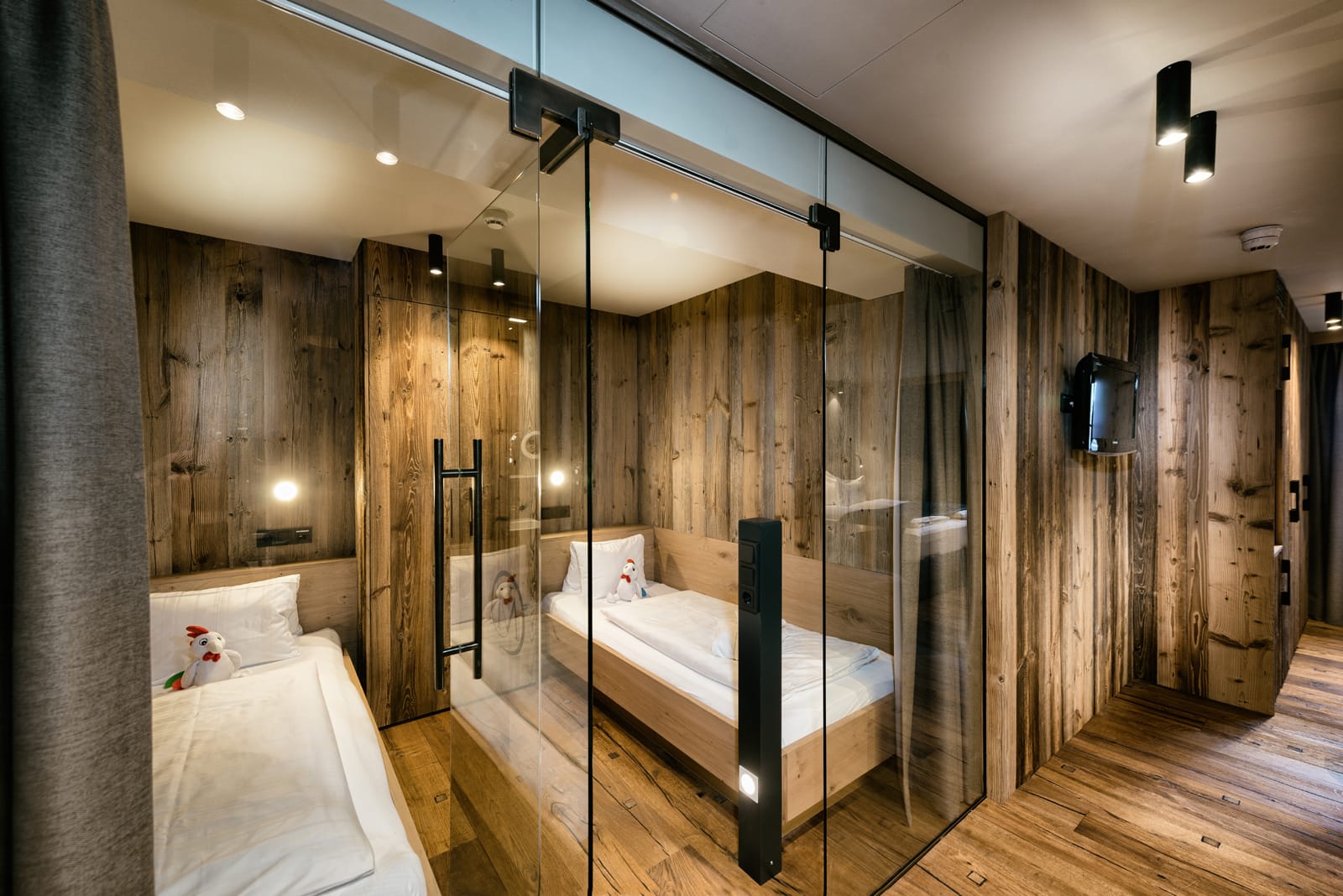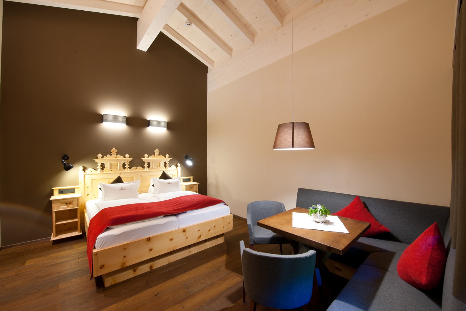 Die edle Einrichtung verzaubert mit wertvollen Materialien und rustikalen Zirben-Altholzdesign.