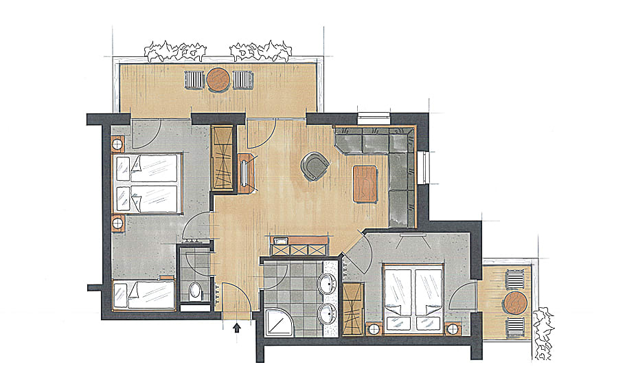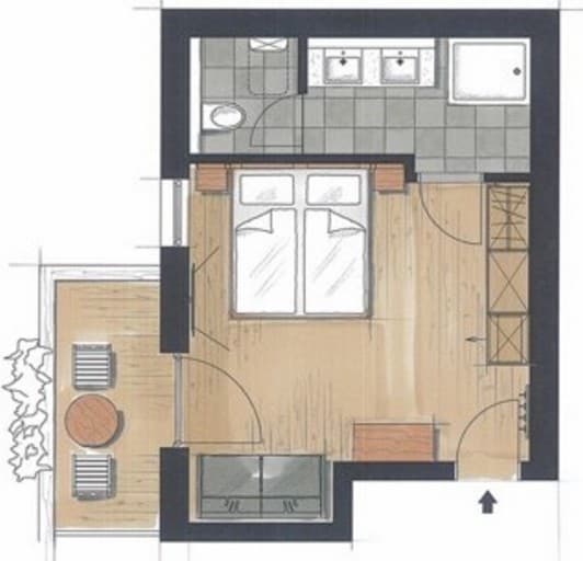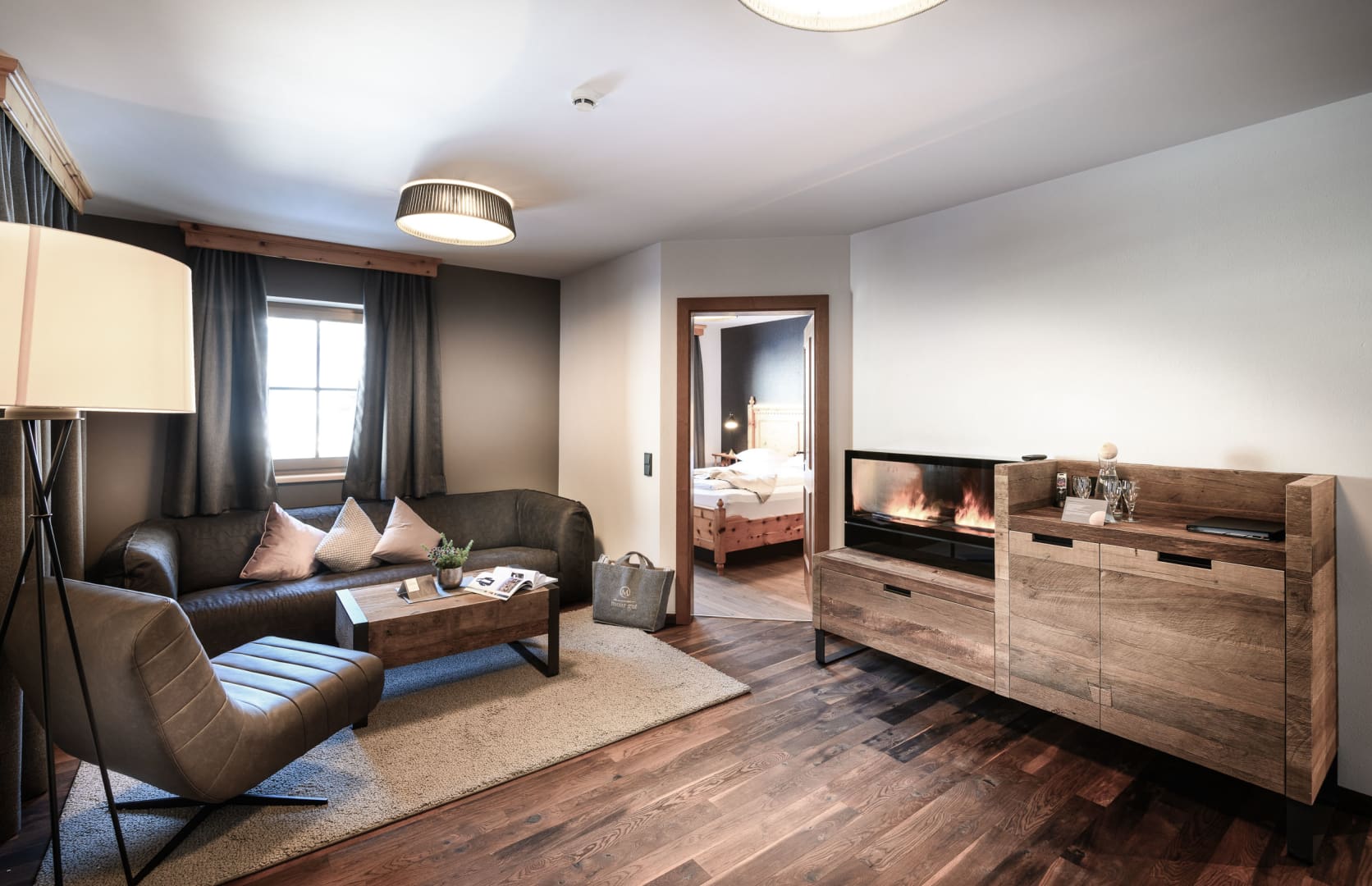 Im gewohnten Moar-Gut Qualitätsstandart ist diese neue Hotelsuite in Wohnraum, Kommode mit Kühlschrank u. Wasserkocher, Sitzecke, zwei Schlafzimmern, Bad und getrenntes WC eingeteilt. Mit Balkon oder Terrasse buchbar.