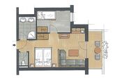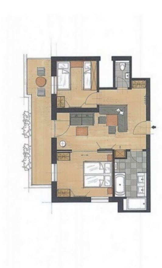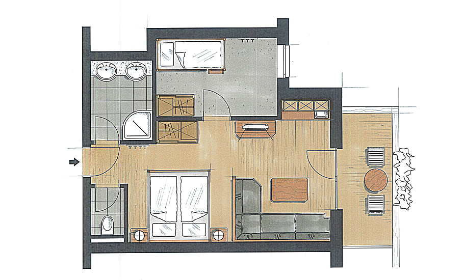 Einem Schlafraum mit gemütlichem Wohnbereich, getrenntem Kinderzimmer, Kommode mit Kühlschrank und Wasserkocher, Badezimmer, getrenntes WC und der Balkon oder Terrasse bieten Platz für einen Wohlfühlurlaub.