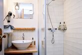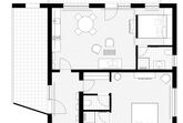 Das Apartment verfügt über ein Schlafzimmer mit einem komfortablen Doppelbett und einem Stockbett. Das Badezimmer ist mit einer Dusche und einem WC ausgestattet. Der Wohnbereich bietet ausreichend Platz für bis zu 8 Personen und ist durch eine stilvolle Wohnwand vom Schlafbereich mit einem französischen Bett getrennt. Ein weiteres Badezimmer mit Dusche und WC steht ebenfalls zur Verfügung.