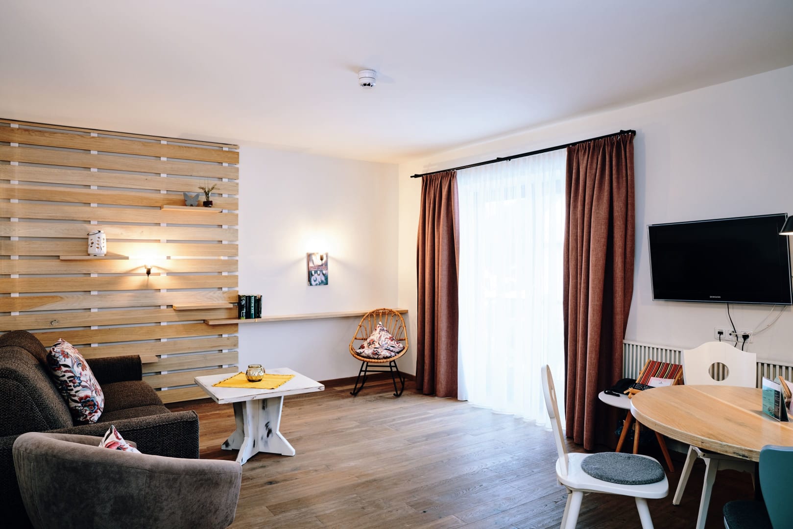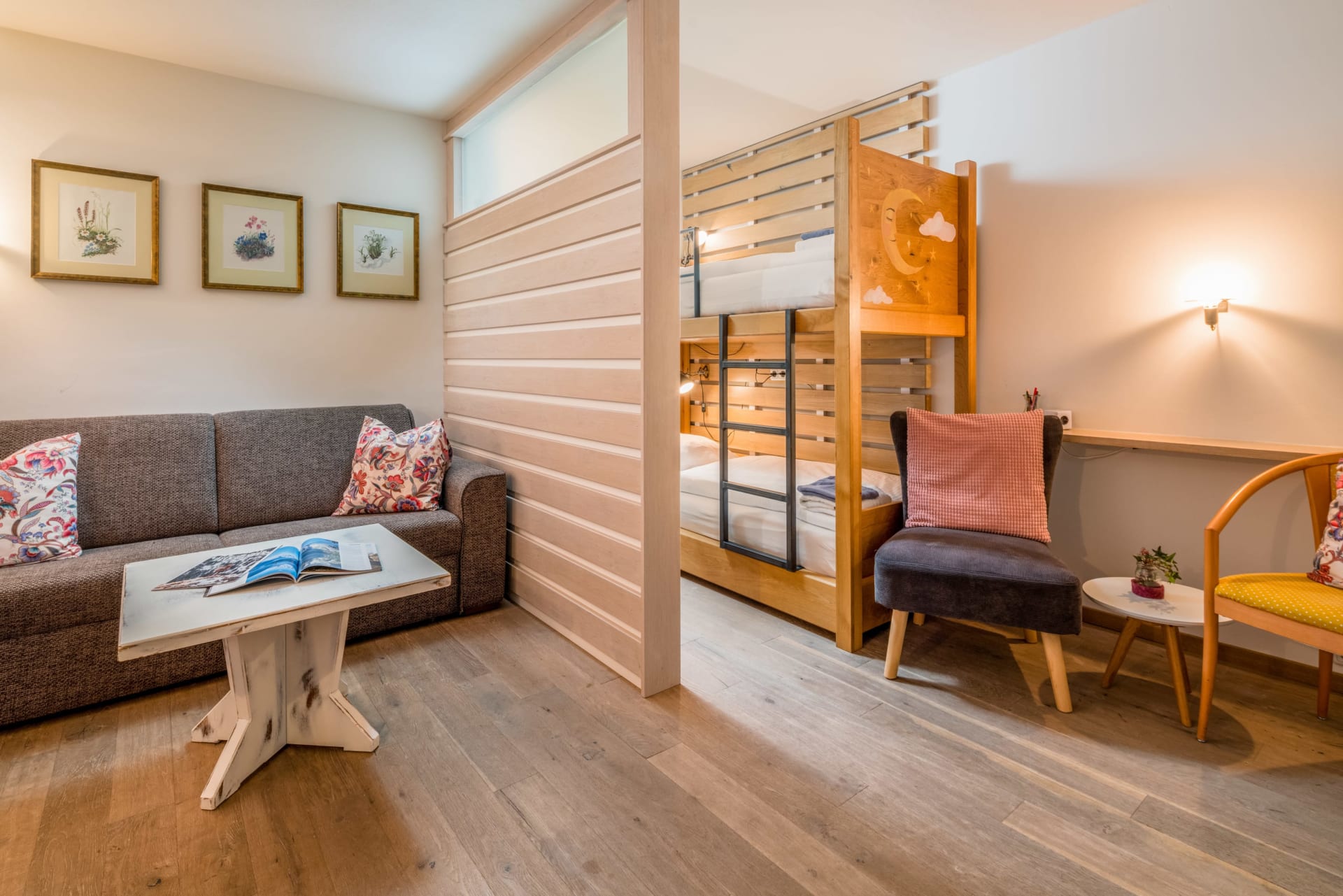 Erleben Sie einen unvergesslichen Aufenthalt in unserer komfortablen Wohnung mit herrlichem Blick auf die umliegende Berglandschaft. Die Wohnung verfügt über ein gemütliches Schlafzimmer mit Doppelbett sowie einen Wohnbereich mit Stockbetten, der durch eine elegante Sichtwand abgetrennt ist – ideal für Familien.