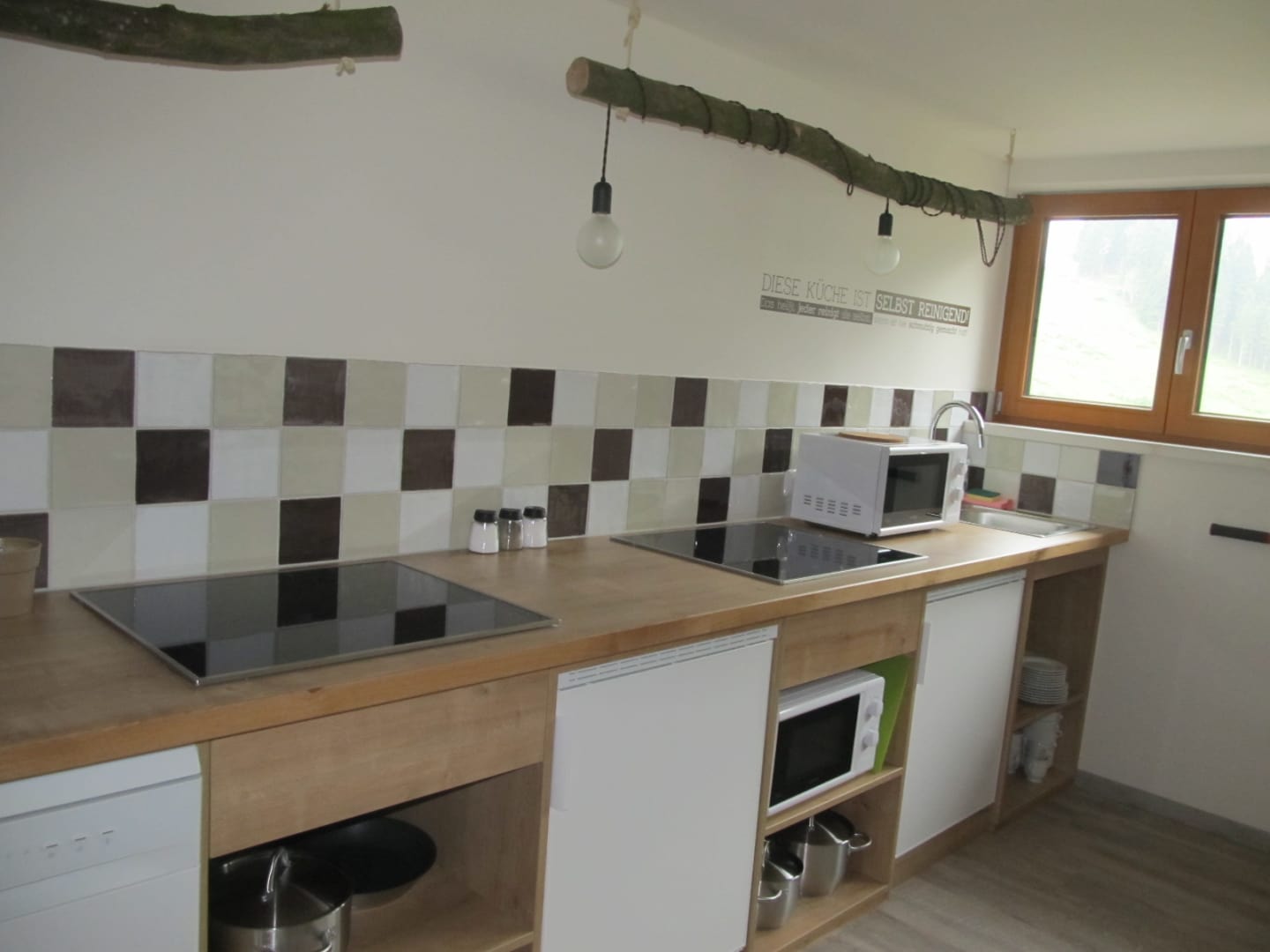 Der einladende Essbereich und die bequeme Couch laden zum Verweilen ein. Die moderne Küche ist mit einem 4-Plattenherd, einer Mikrowelle, einem Wasserkocher und einer vollständigen Küchenausstattung versehen, sodass Sie sich wie zu Hause fühlen können.