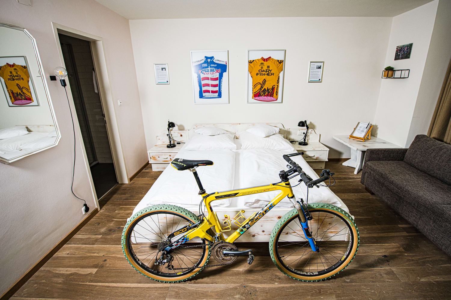 ### Exklusives Mountainbike-Zimmer für Radsportbegeisterte Tauchen Sie ein in unser einzigartiges Mountainbike-Zimmer, das ganz der Leidenschaft für das Radfahren gewidmet ist. Hier erwartet Sie eine stilvolle und komfortable Umgebung, perfekt für alle, die das Abenteuer auf zwei Rädern lieben. Genießen Sie den Komfort eines Kingsize-Bettes, Highspeed-WLAN, einen Safe für Ihre Wertsachen und einen Fernseher für entspannende Abende. Das Badezimmer verfügt über eine separate Dusche und WC sowie einen Haartrockner. Selbstverständlich sind Handtücher und frische Bettwäsche inklusive. Beginnen Sie Ihren Tag mit einem köstlichen Frühstücksbuffet, das optional hinzugebucht werden kann. Stärken Sie sich für Ihre nächste Mountainbike-Tour in den Bergen!