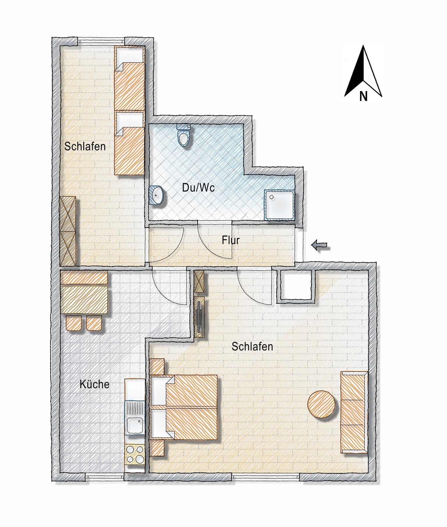Diese Ferienwohnung ist nach Süden ausgerichtet und ist mit einem Wohn - Schlafzimmer, einem weiteren Schlafzimmer, einer Wohnküche mit Spülmaschine, Backofen, Mikrowelle, TV und Du/Wc ausgestattet.