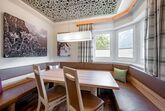 eine hochwertig ausgestattete Küche mit Essecke, Kühlschrank inkl. kleinem Gefrierfach, Geschirrspüler, Backofen, 4-Platten Ceran-Feld, Toaster, Kaffee- u. Wasserkocher; kompletter Geschirr-, Töpfe- u. Besteckausstattung; Vorraum /Diele;
