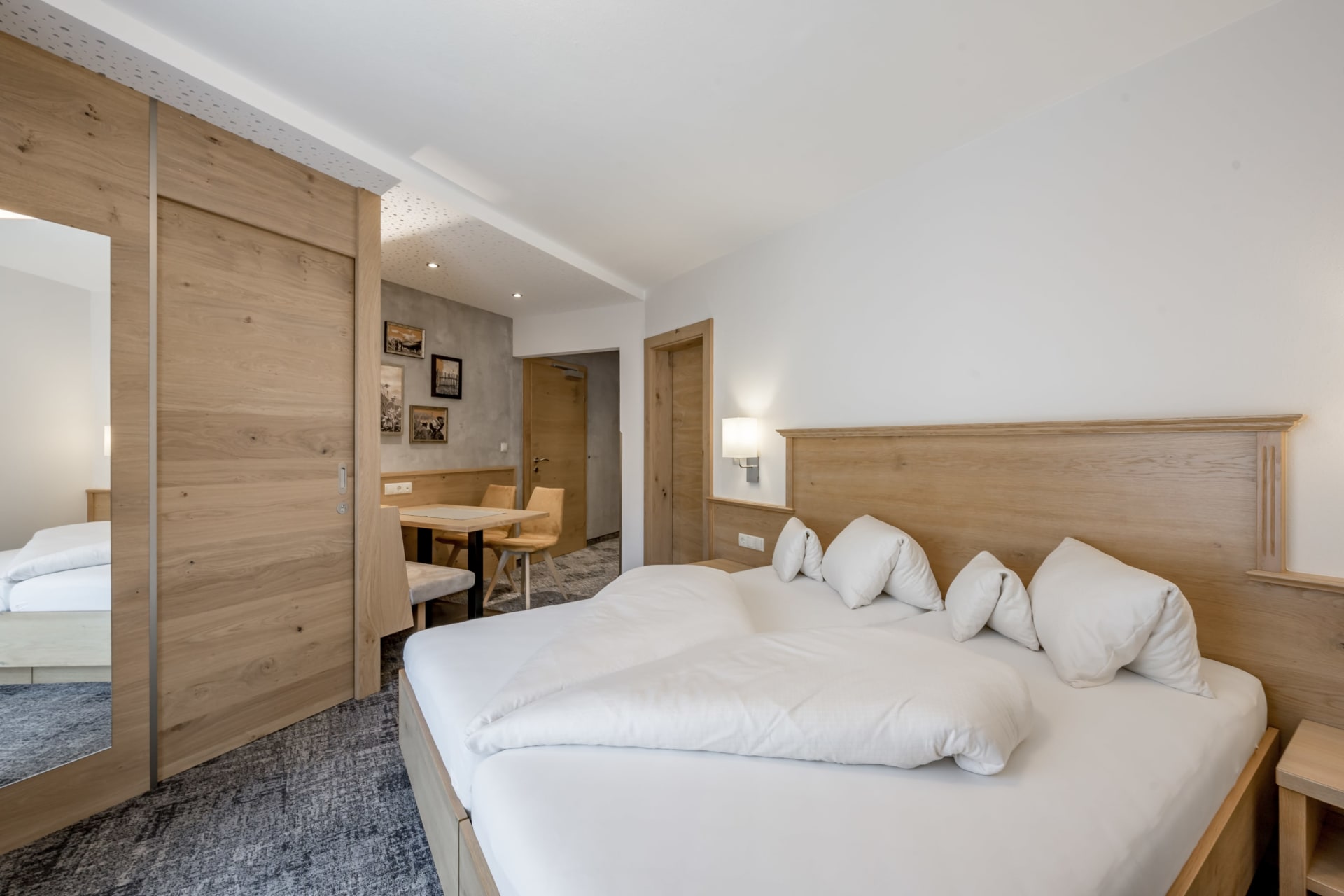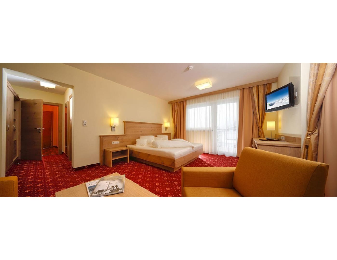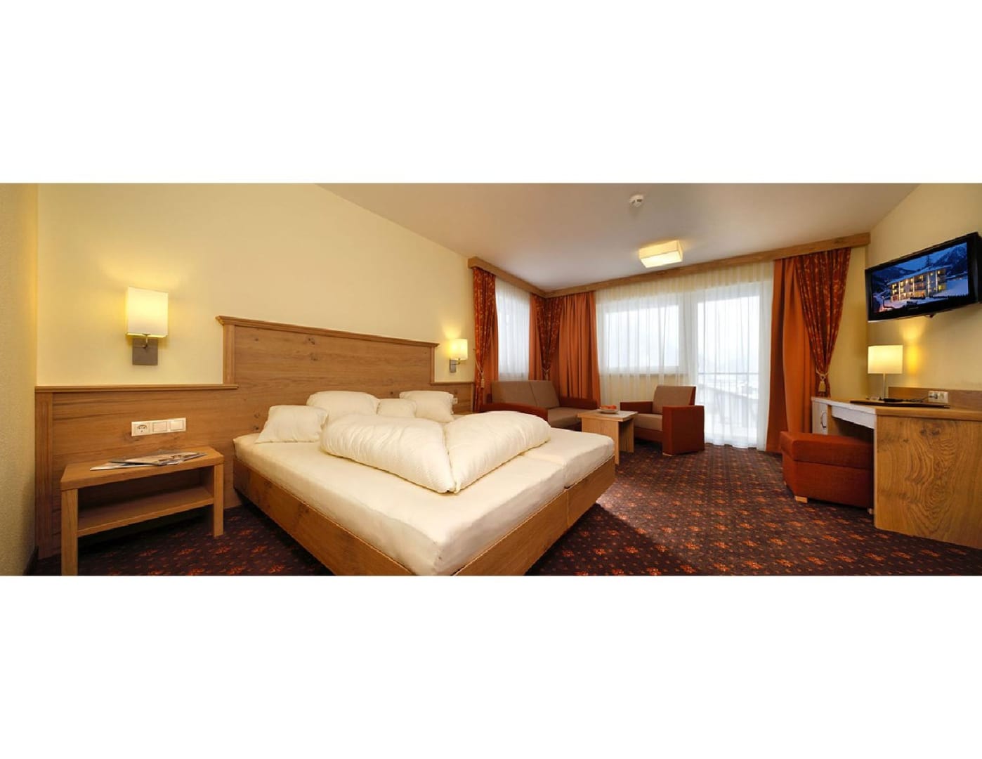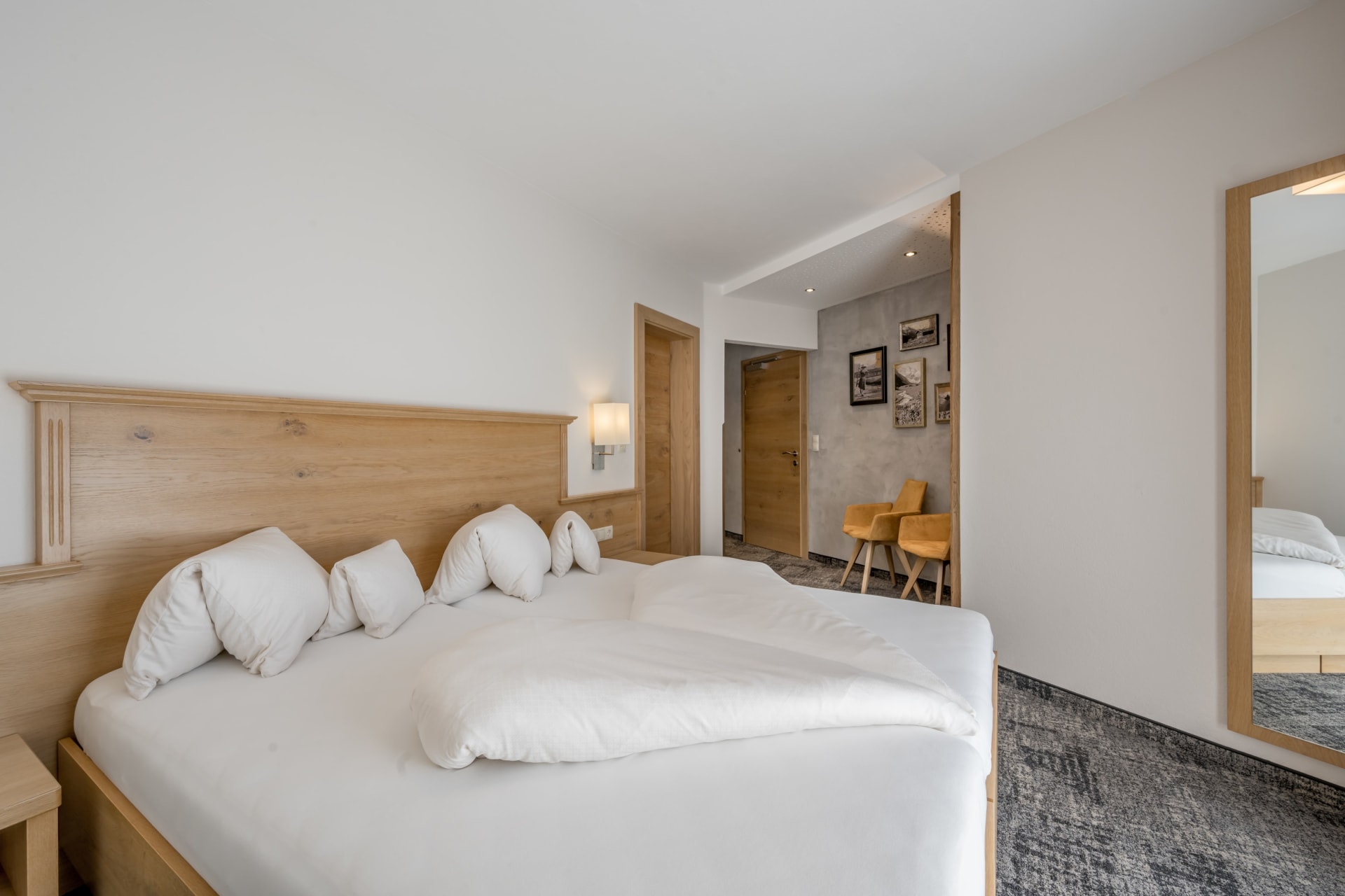 jedes Zimmer mit DU/WC, Fön, beheizter Handtuchhalter, Safe, Flat-TV, gratis WLAN, gemütlicher Sitzbereich, jedes Zimmer mit kleinem franz. Balkonvorsprung und traumhaftem Panorama-Bergblick, Vorraum/Schrankraum;