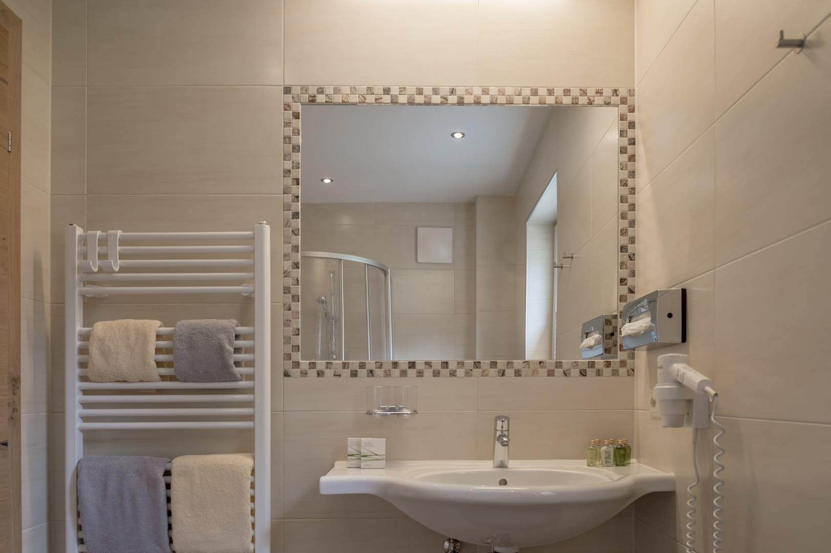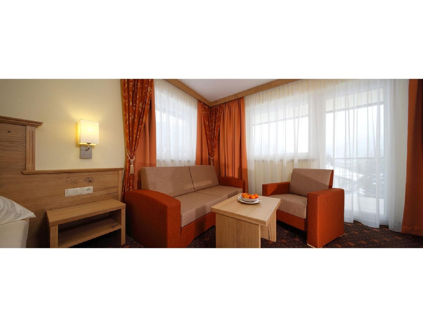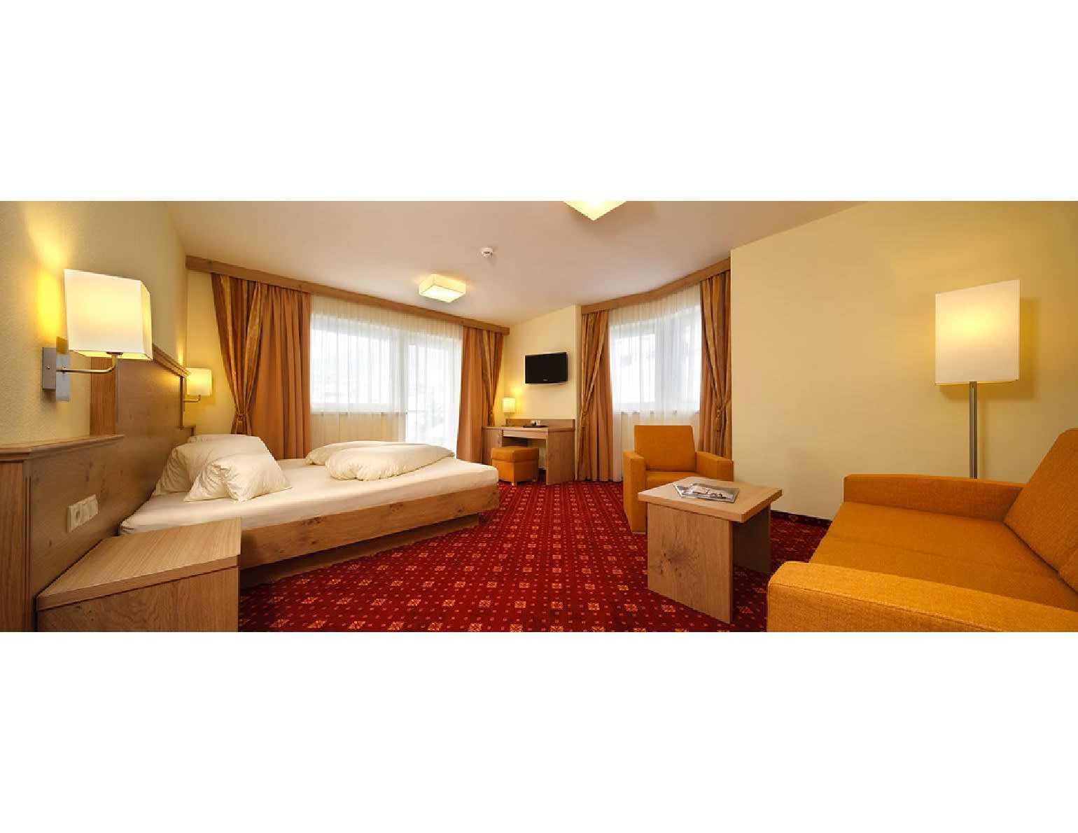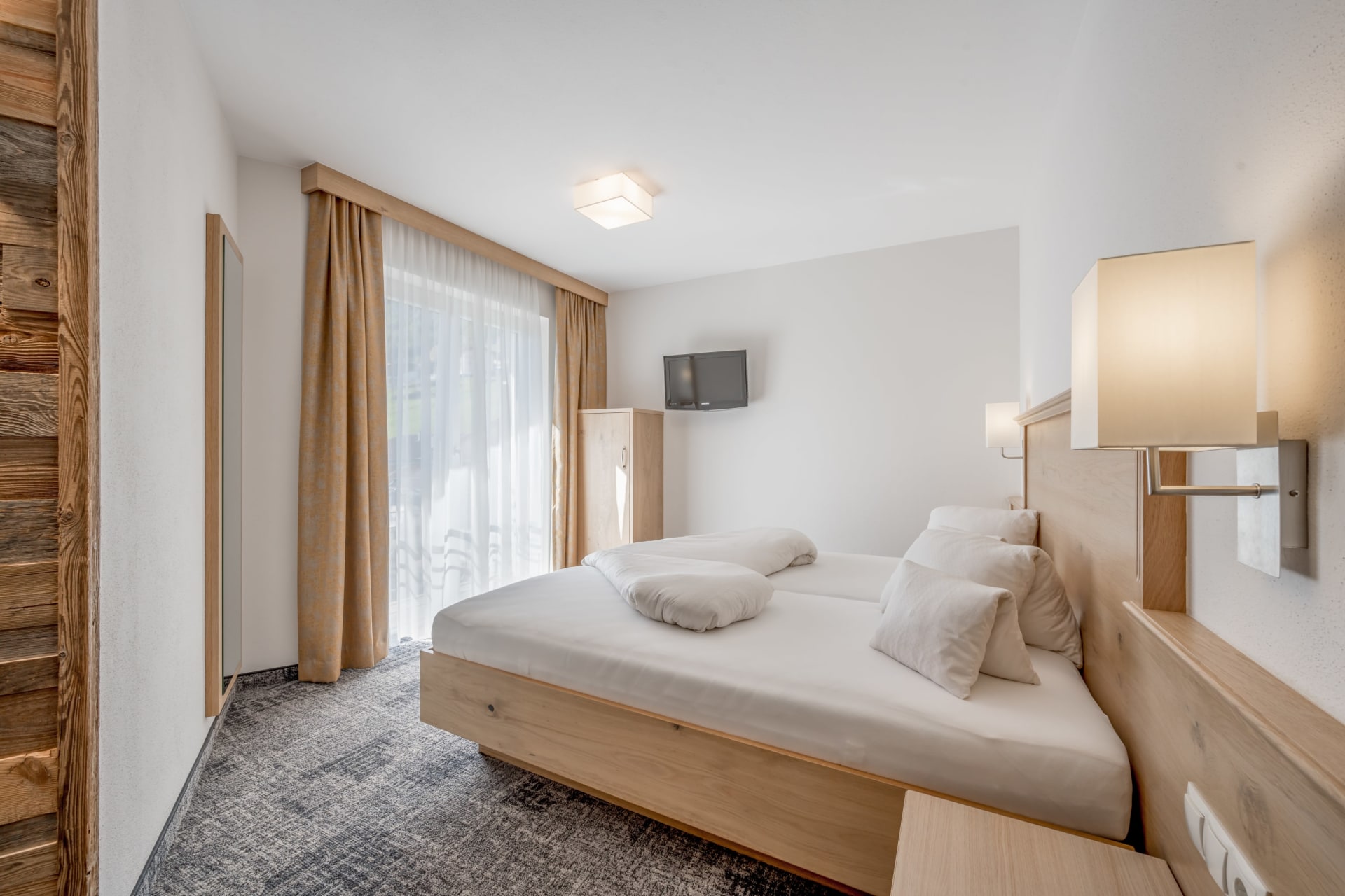 jedes Zimmer mit DU/WC, Fön, beheizter Handtuchhalter, Safe, Flat-TV, gratis WLAN, gemütlicher Sitzbereich, jedes Zimmer mit kleinem franz. Balkonvorsprung und traumhaftem Panorama-Bergblick, Vorraum/Schrankraum;