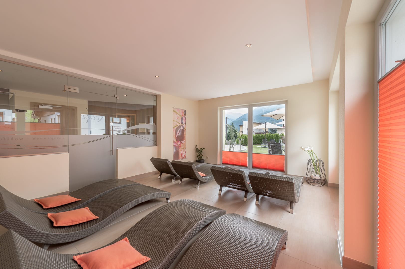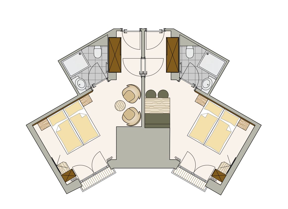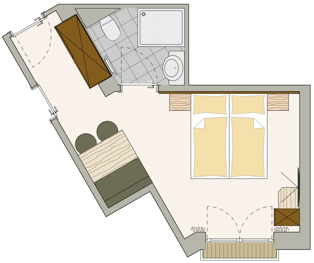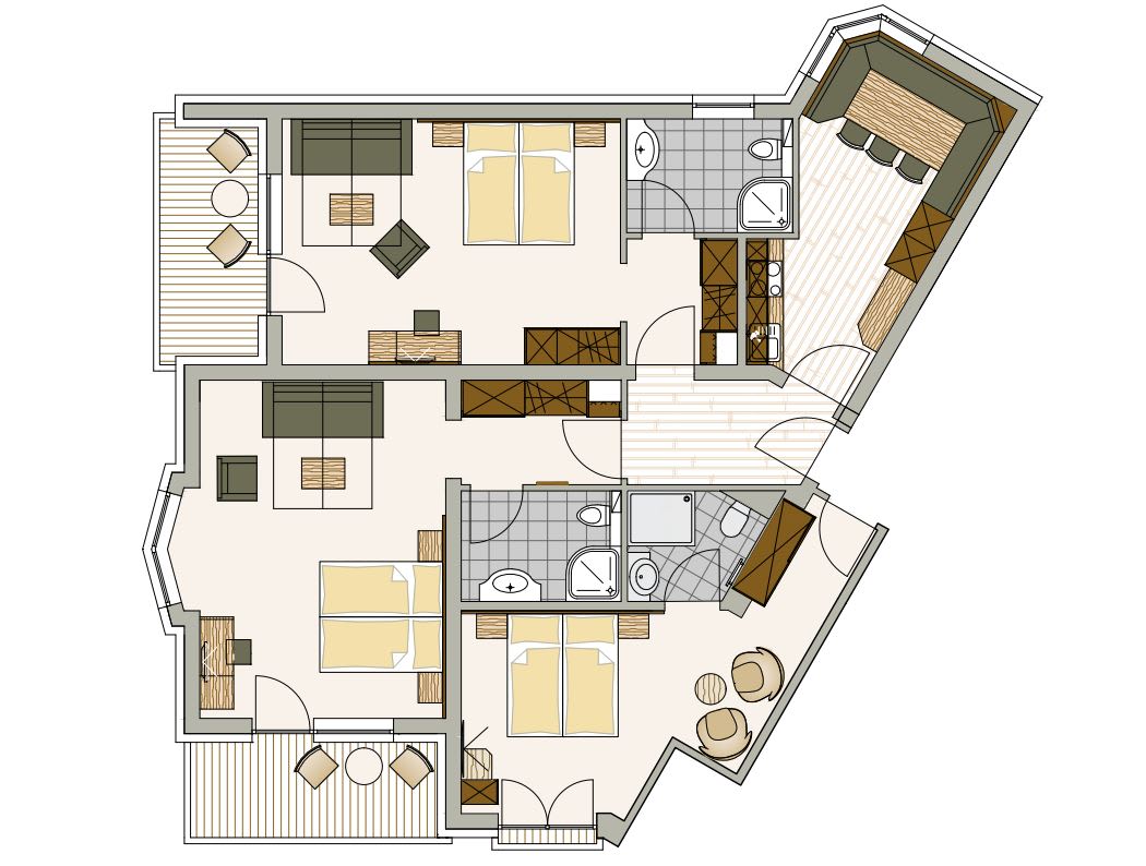 jedes Zimmer mit DU/WC, Fön, beheizter Handtuchhalter, Safe, Flat-TV, gratis WLAN, gemütlicher Sitzbereich, jedes Zimmer mit kleinem franz. Balkonvorsprung und traumhaftem Panorama-Bergblick, Vorraum/Schrankraum;