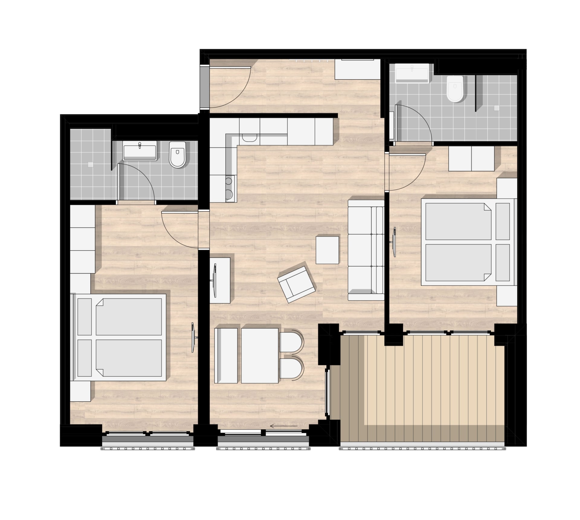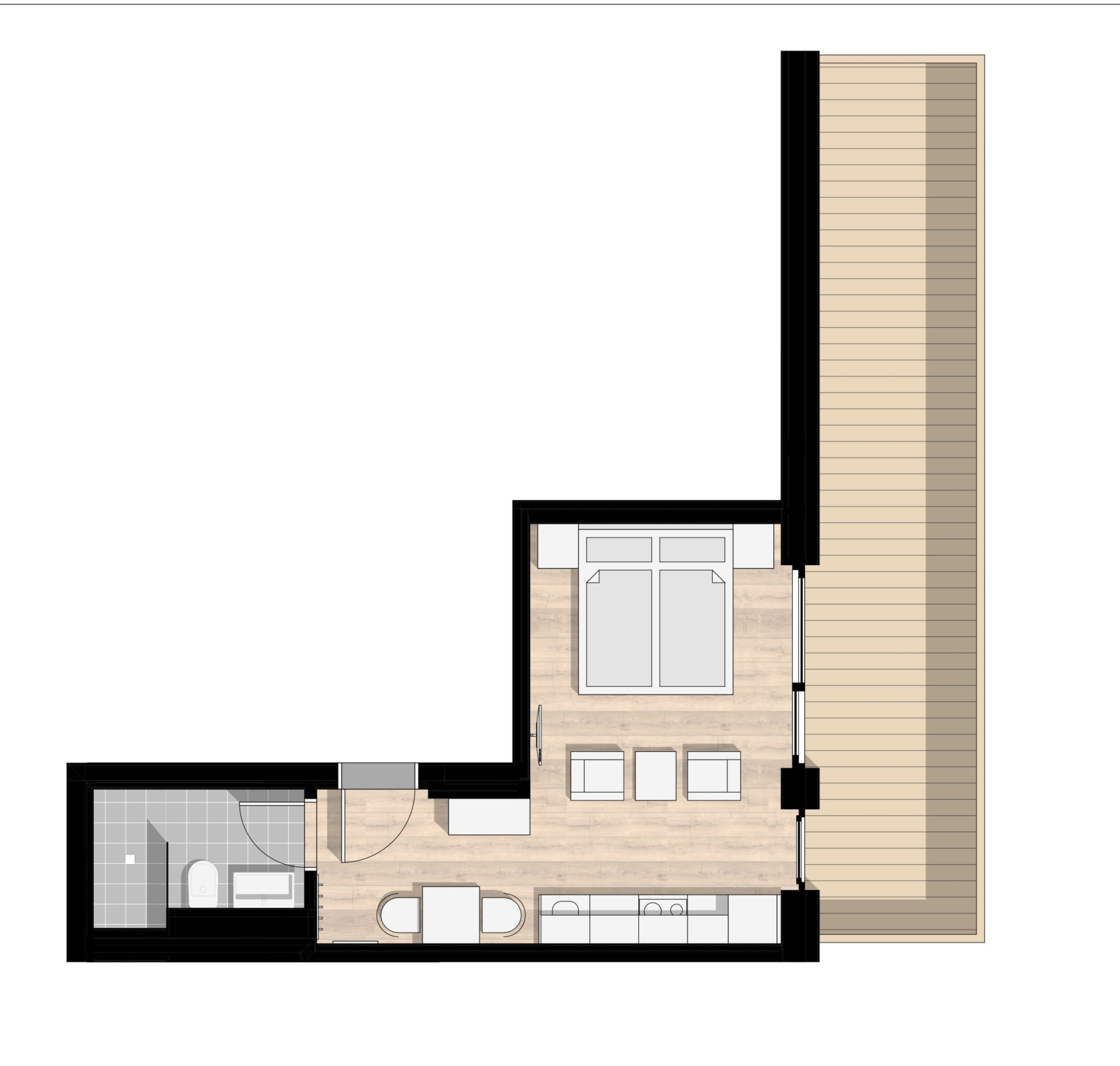 Die dargestellte Apartmentansicht ist ein Musterzimmer und kann in Form, Farbe und Aussicht im Haus abweichen
