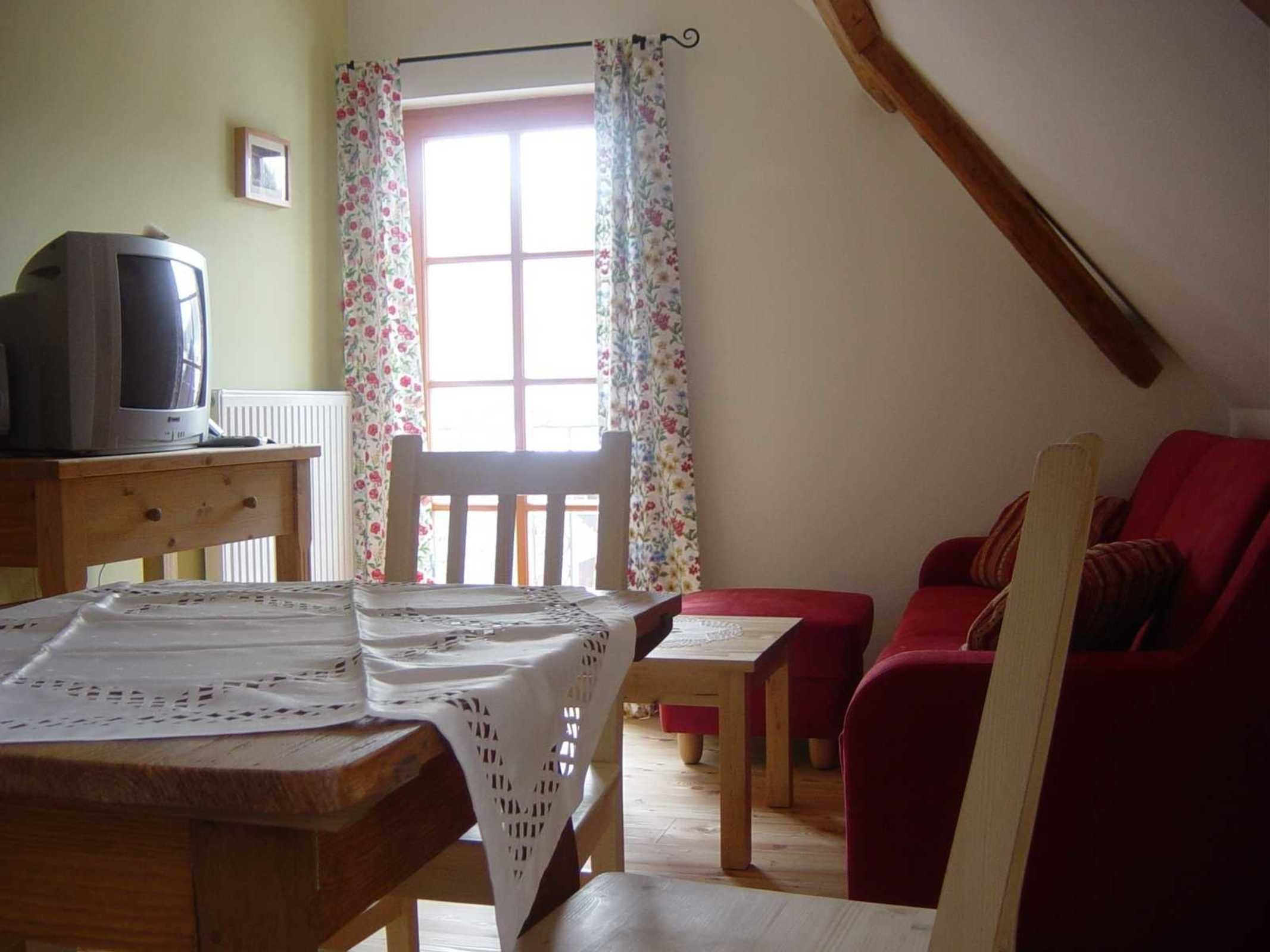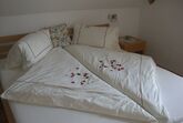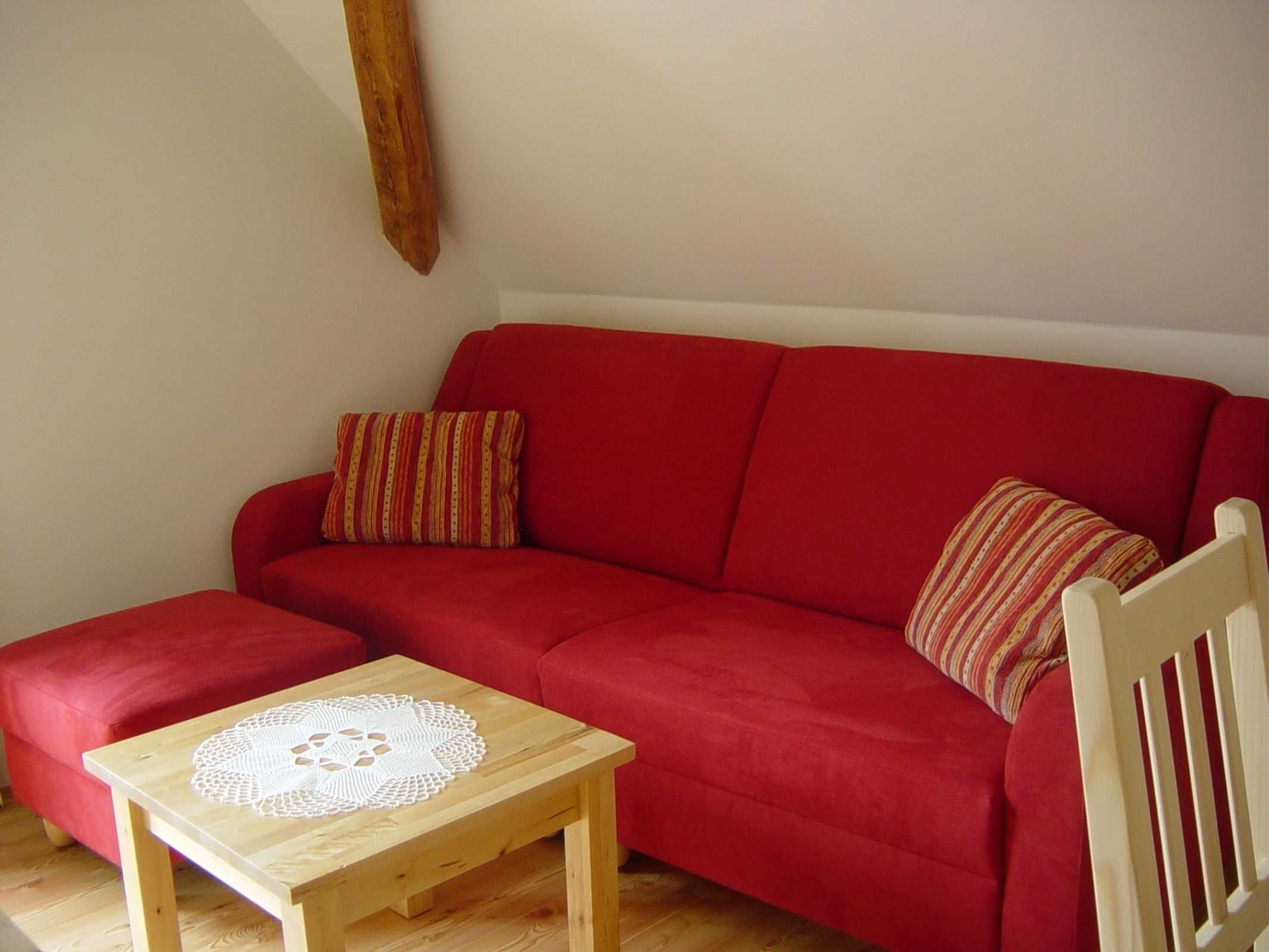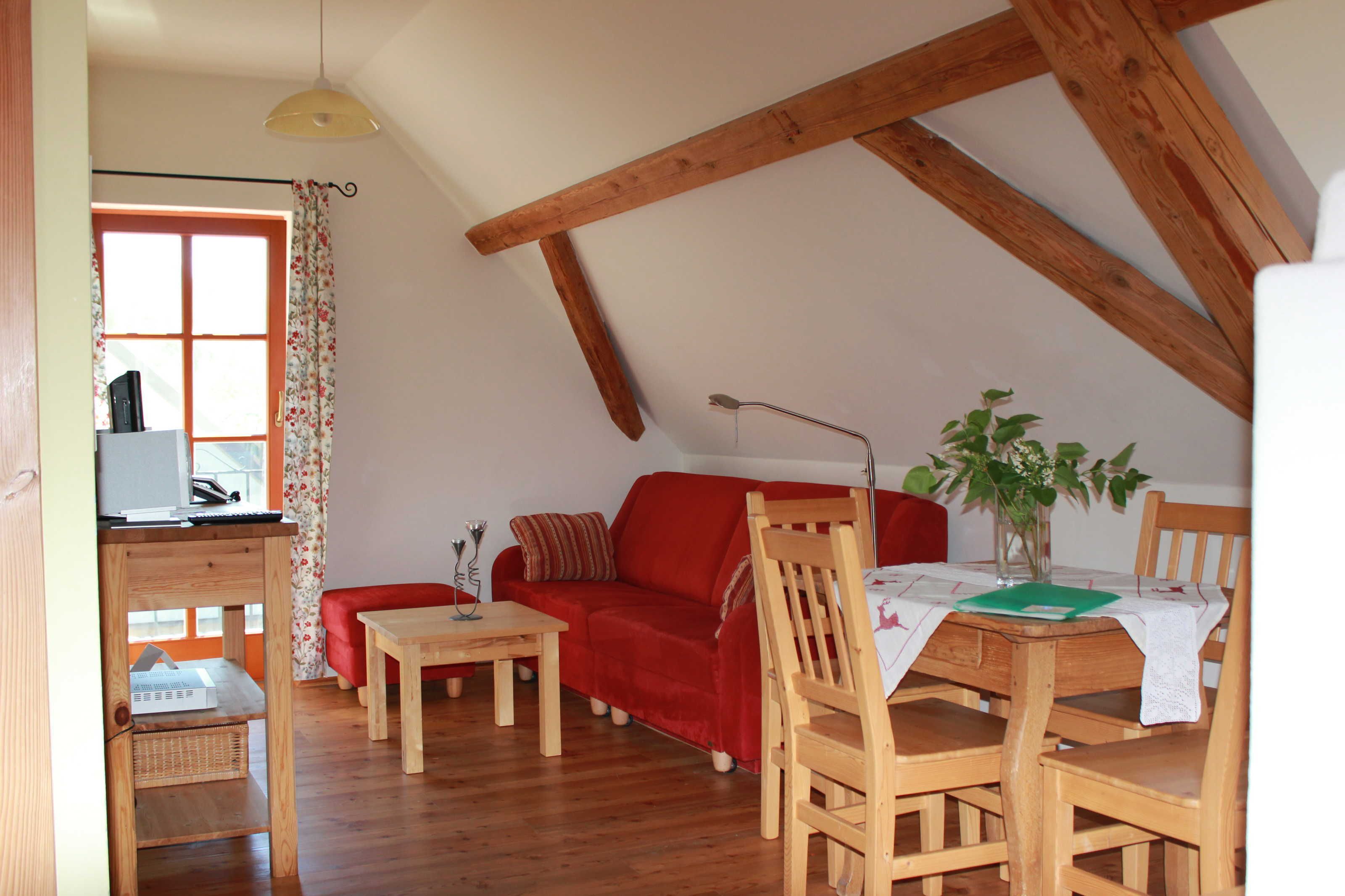 Unser Kräutergarten ist allergikerfreundlich. Schlafzimmer mit Doppelbett, Wohnraum mit bis zu zwei Zusatzbetten und Küche, Badezimmer mit Dusche und mit getrennten WC.