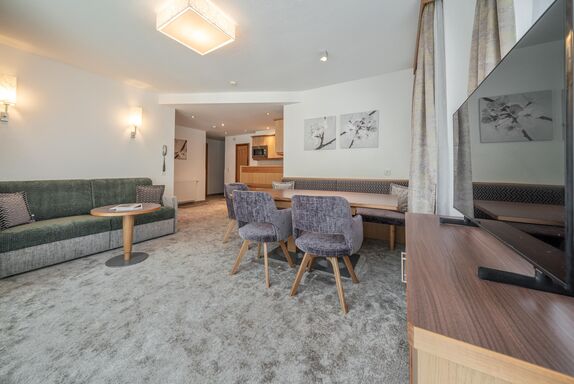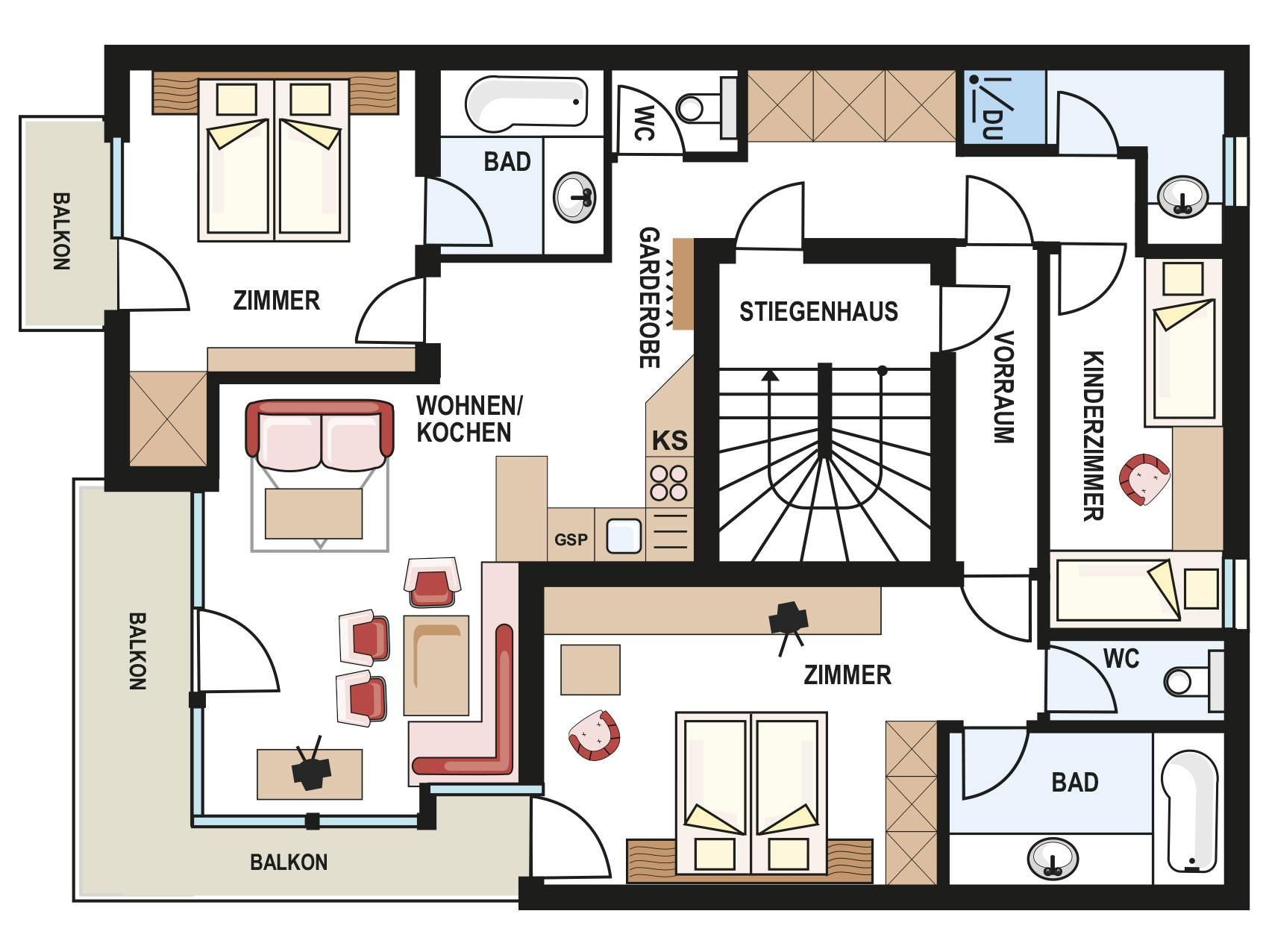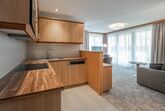 Appartement Typ B3 Kombi mit 2 Doppelzimmer (Zusatzbett in einem der Doppelzimmer möglich), 1 Kinderzimmer mit 2 getrennten Betten (Längen 1x 2 m und 1x 1,80 m), 2 Badezimmer mit Duschbadewanne, 1 Badezimmer mit Dusche, 2 separate WC, Kosmetikspiegel, Fön; Wohnküche mit Ecktisch, Couchecke, Cerankochfeld, Geschirrspüler, Kühlschrank, Mikrowelle, Kabel-TV, Safe, Süd-West-Balkon. Größe ca. 95 m²