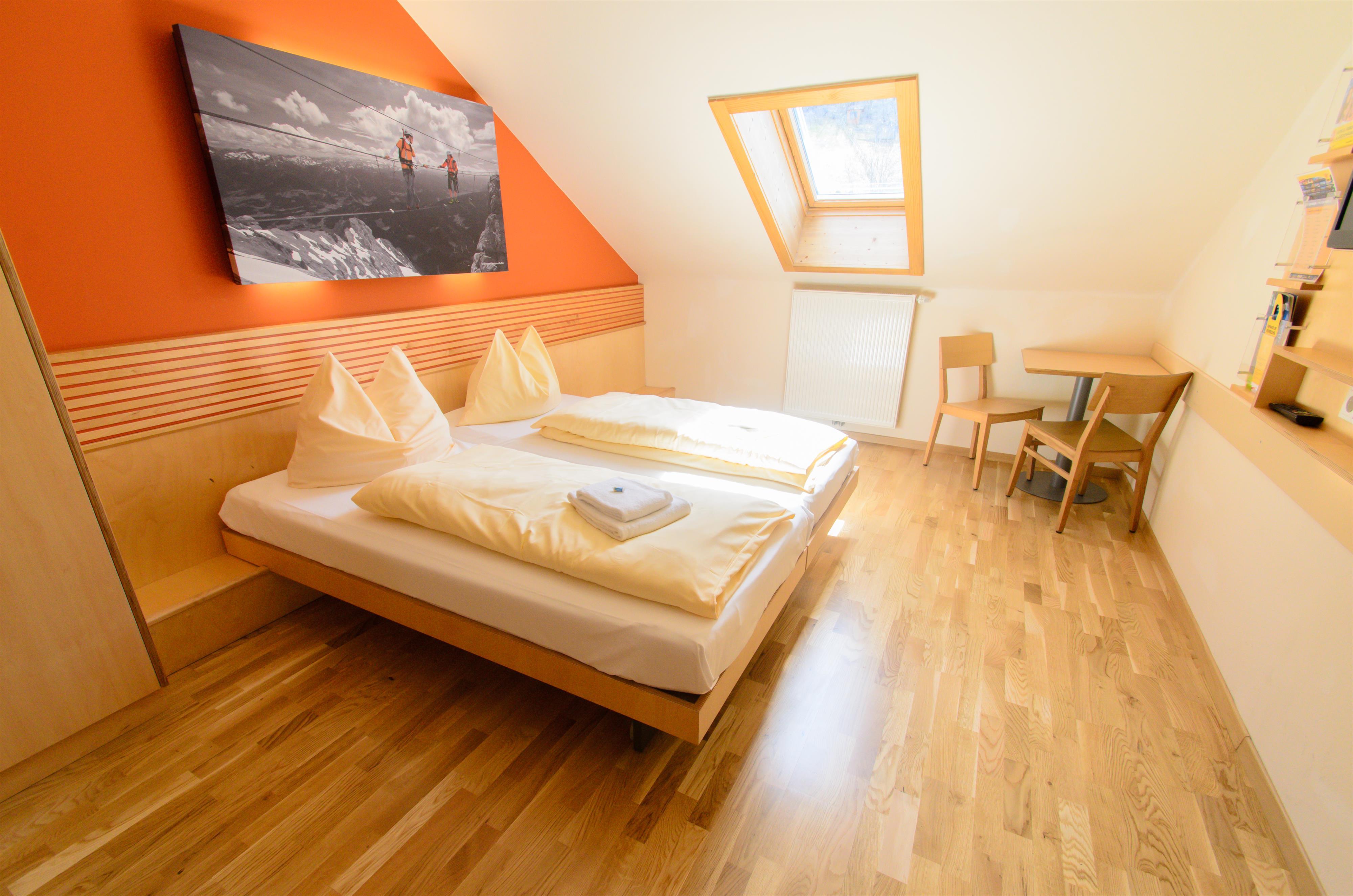 Helle und freundliche Zimmer mit flexiblen Bettensystemen (Doppel-, Einzel-, Sofa-, und Etagenbetten), funktionelle Einrichtung aus natürlichen und regionalen Rohstoffen. Badezimmer mit Dusche/WC