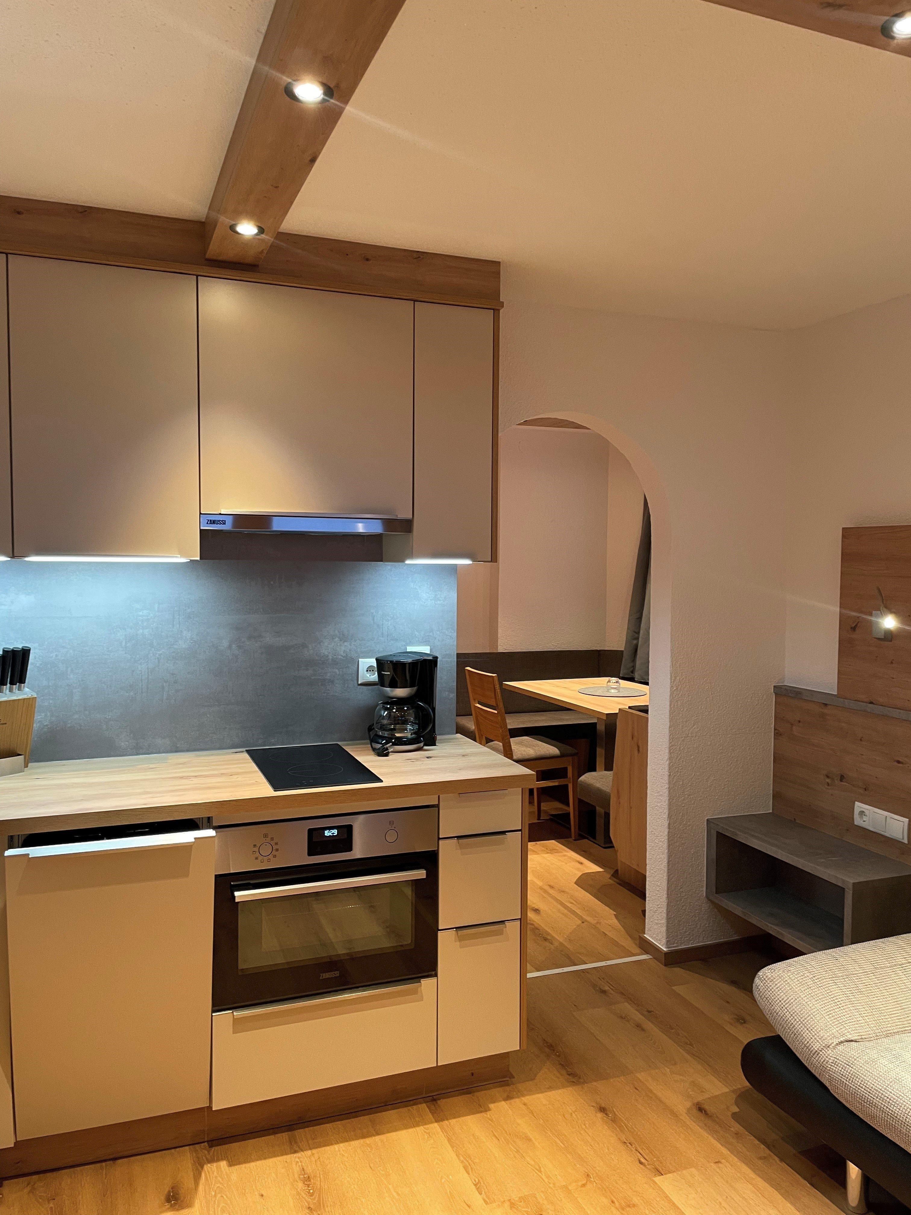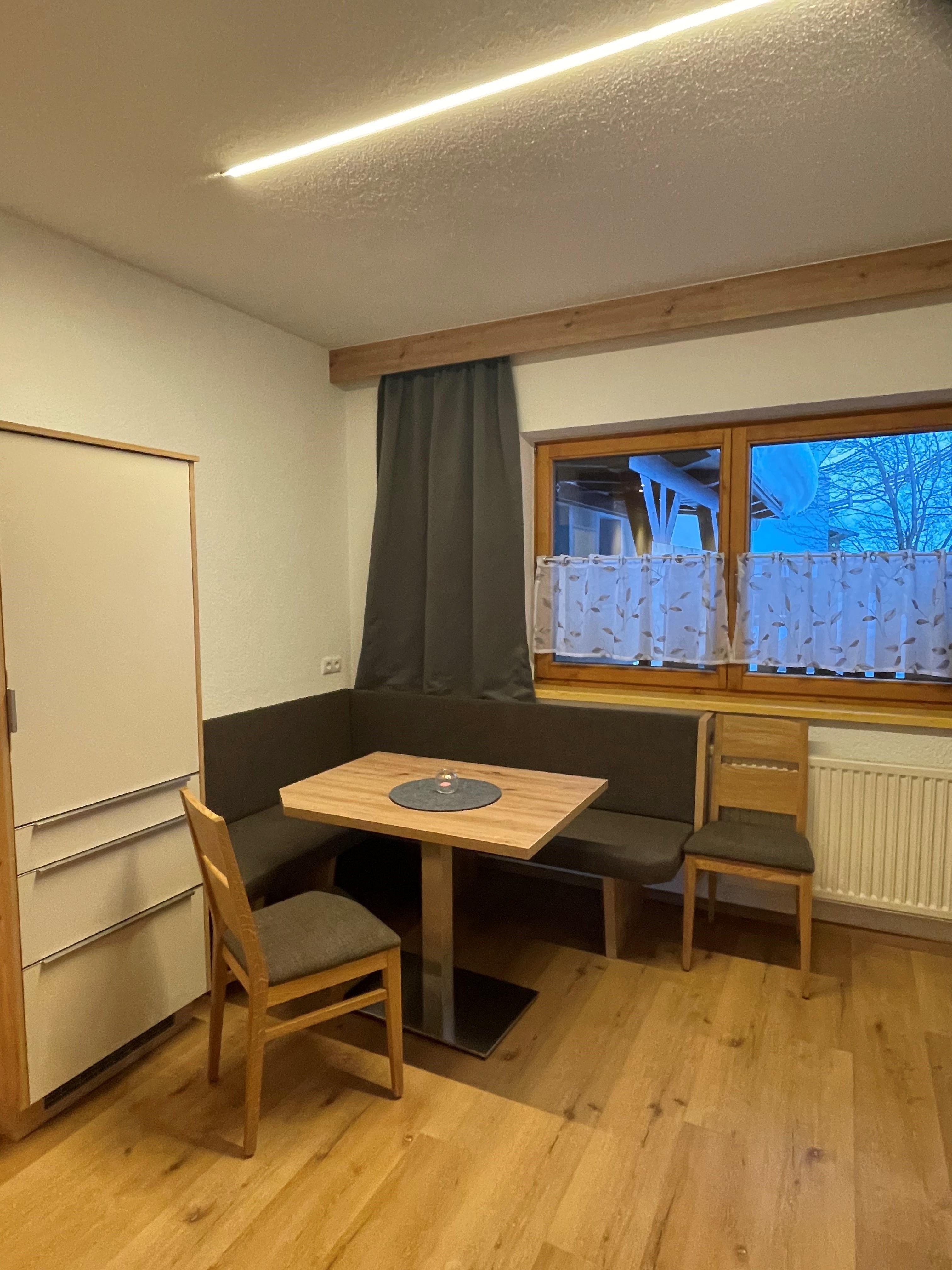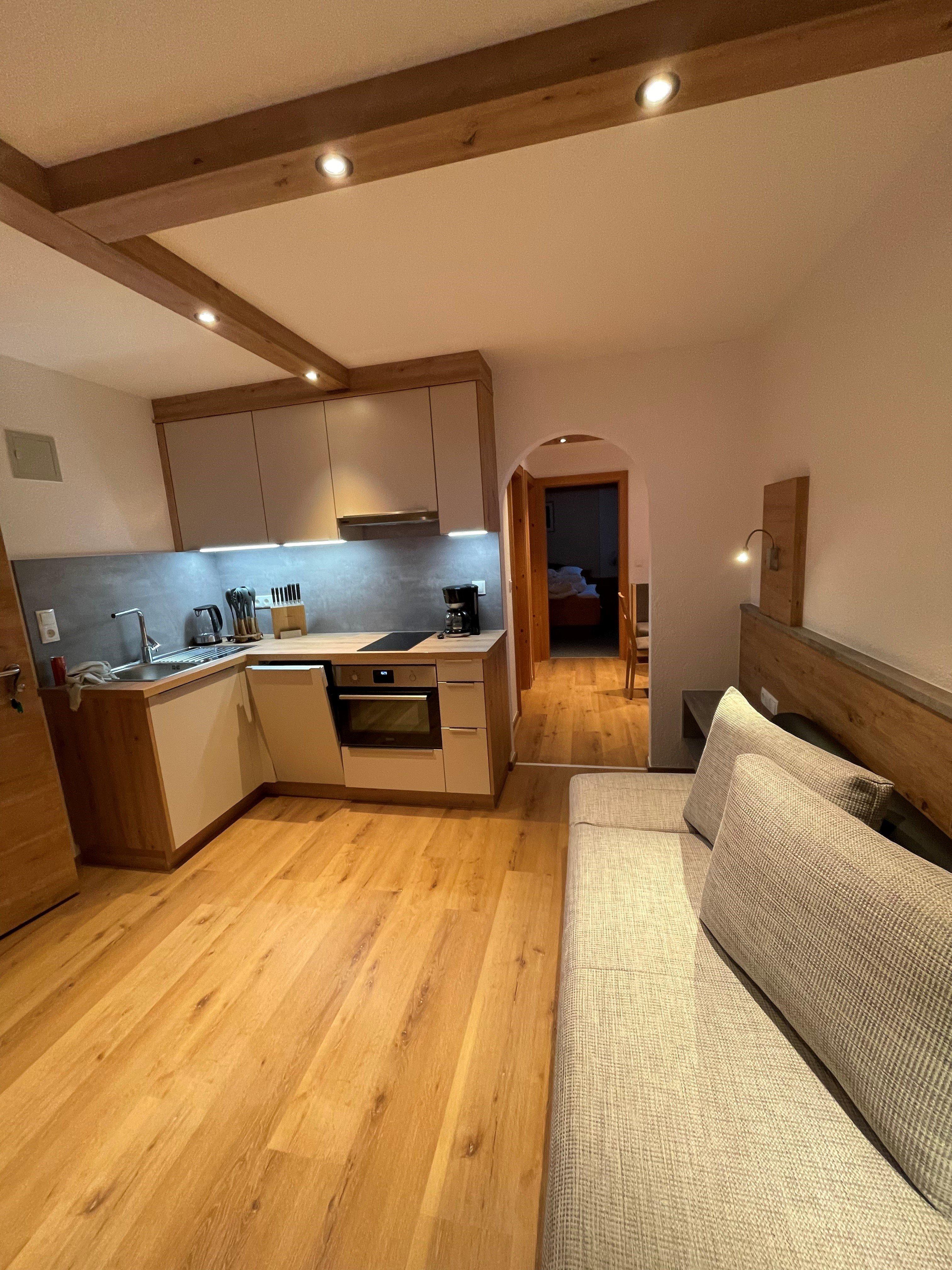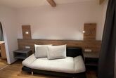 Rustikales Appartement Vent 3 (ca. 40 m²) mit Balkon: 1 Doppelzimmer mit TV, 1 Wohnküche mit 1 Schlafsofa für 1 Personen, TV, vollausgestattete Küchenzeile mit Kühlschrank, Elektroherd (ohne Backofen), Kaffeemaschine, Essecke uvm.; 1 Badezimmer mit Dusche; separates WC.