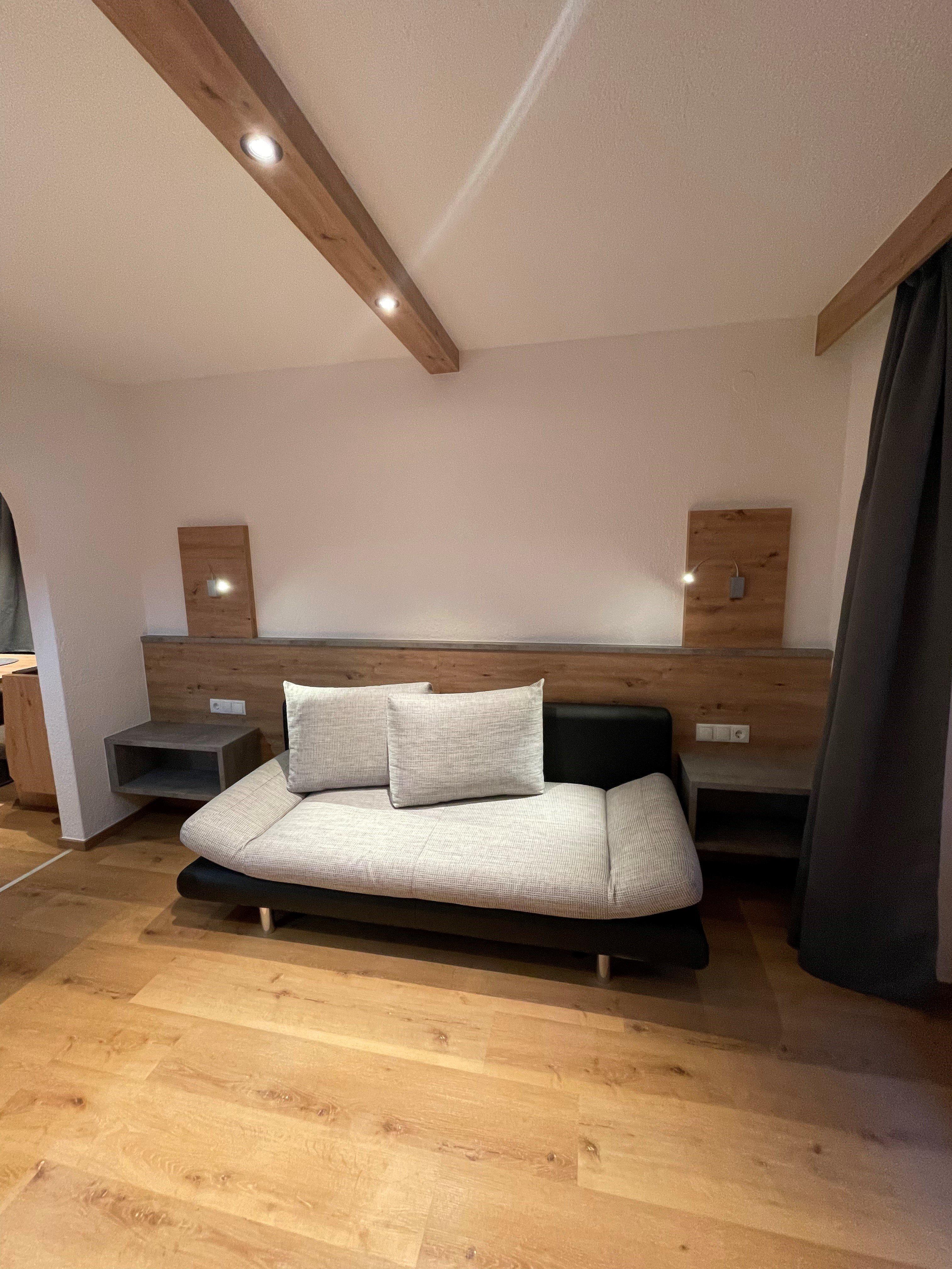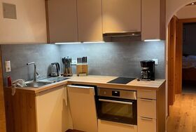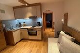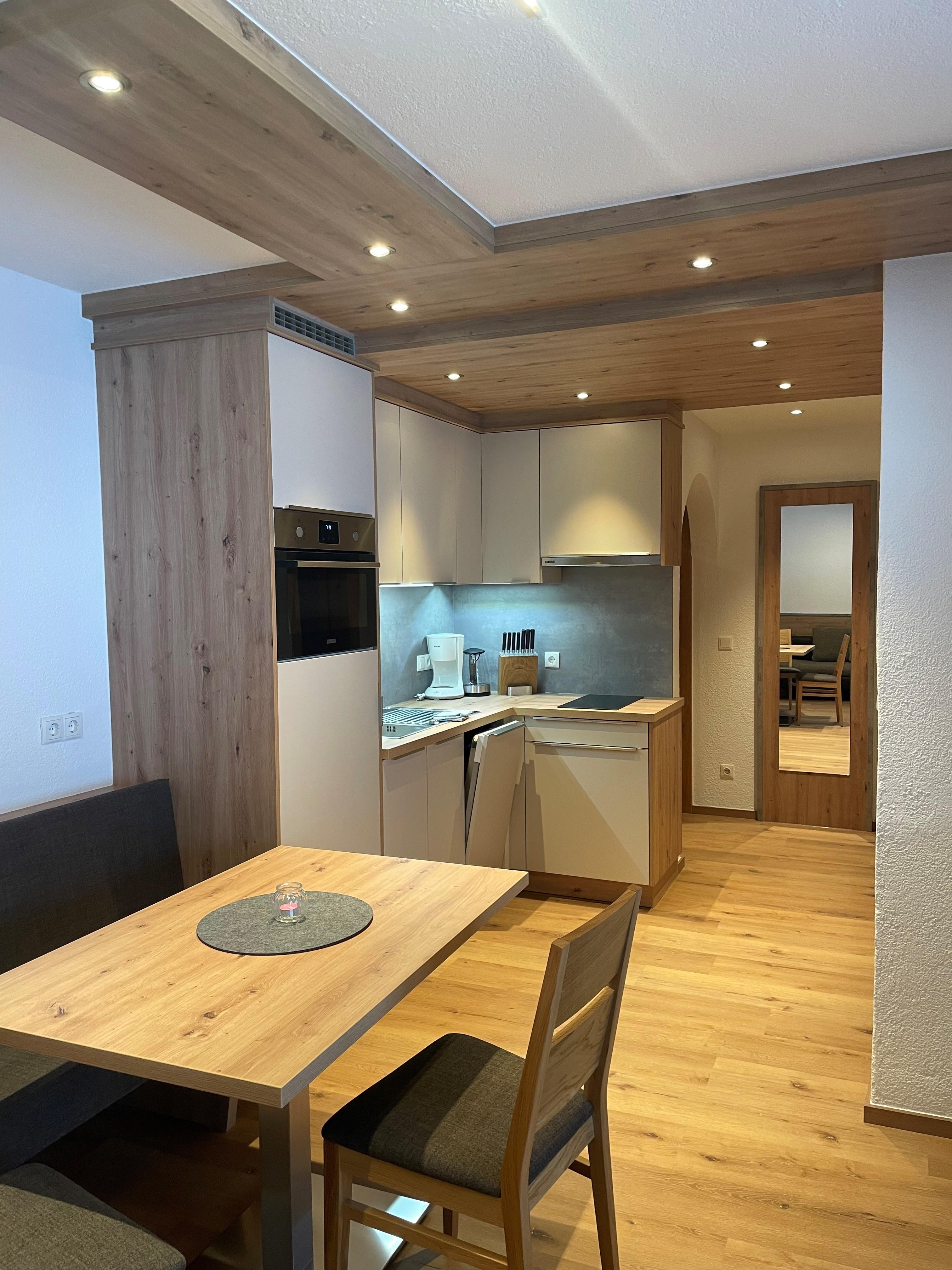 Rustikales Appartement Vent 2 (ca. 40 m²) mit Balkon: 1 Doppelzimmer mit TV, 1 Wohnküche mit 1 Schlafsofa für 1 Personen, TV, vollausgestattete Küchenzeile mit Kühlschrank, Elektroherd (ohne Backofen), Kaffeemaschine, Essecke uvm.; 1 Badezimmer mit Dusche; separates WC.