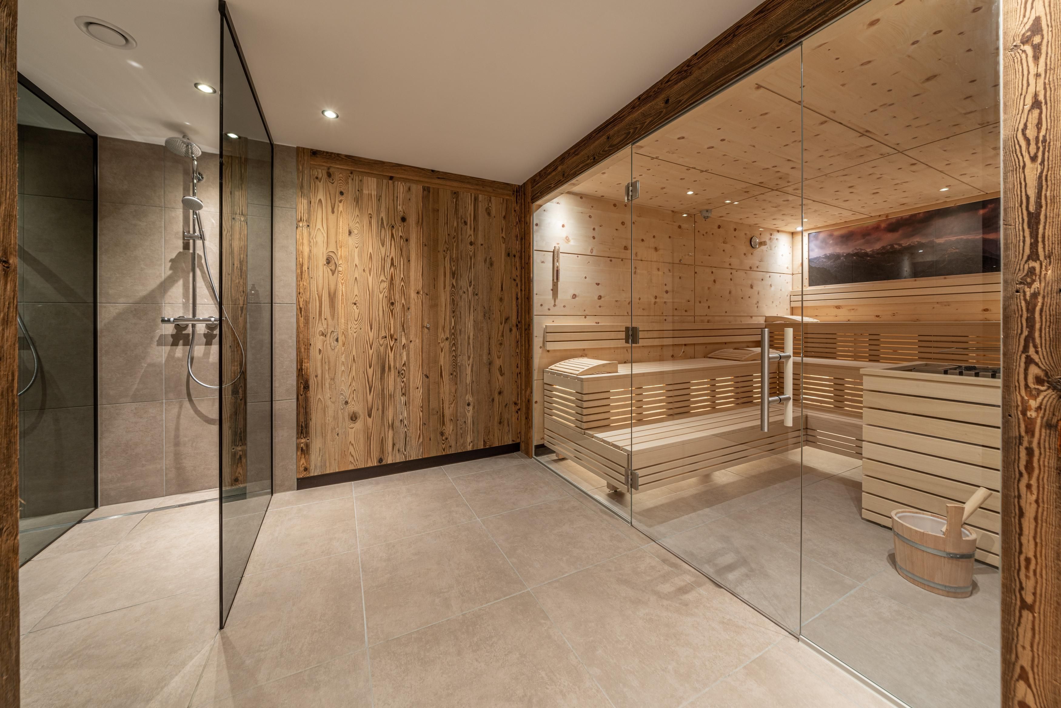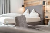 Gemütliches Doppelzimmer Edelweiß im modernen, alpinen Stil. Modernes Boxspringbett, Smart-TV und Safe. Kleiner Wohnbereich mit Schlafmöglichkeit für eine 3. Person. Badezimmer mit Regendusche, WC, Handtuchtrockner und Fön. Balkon mit Bergblick. Größe ca. 35 m²