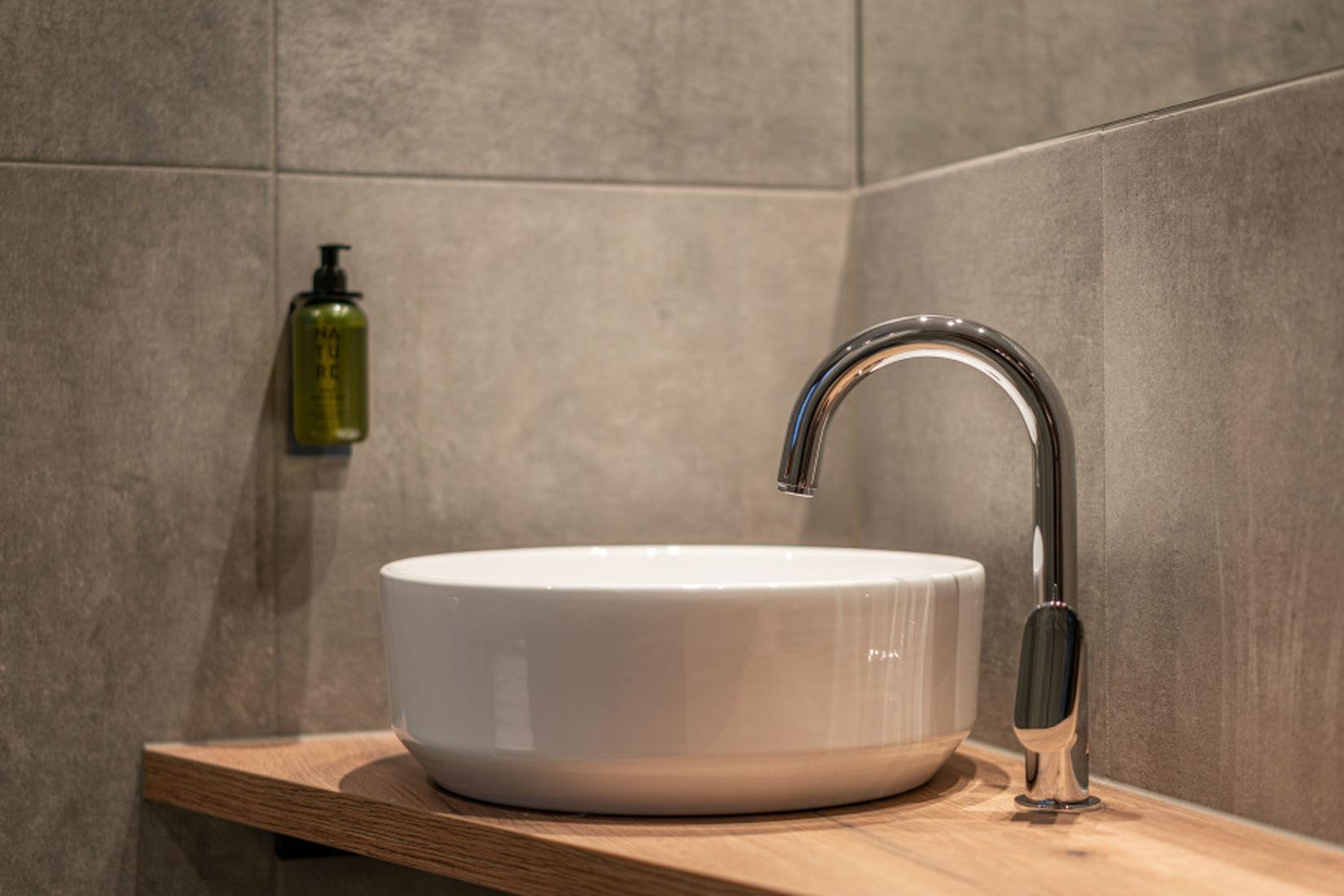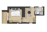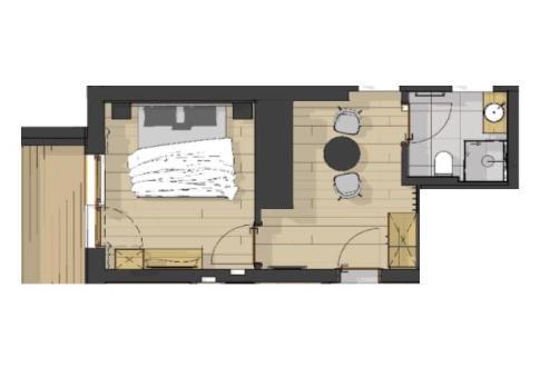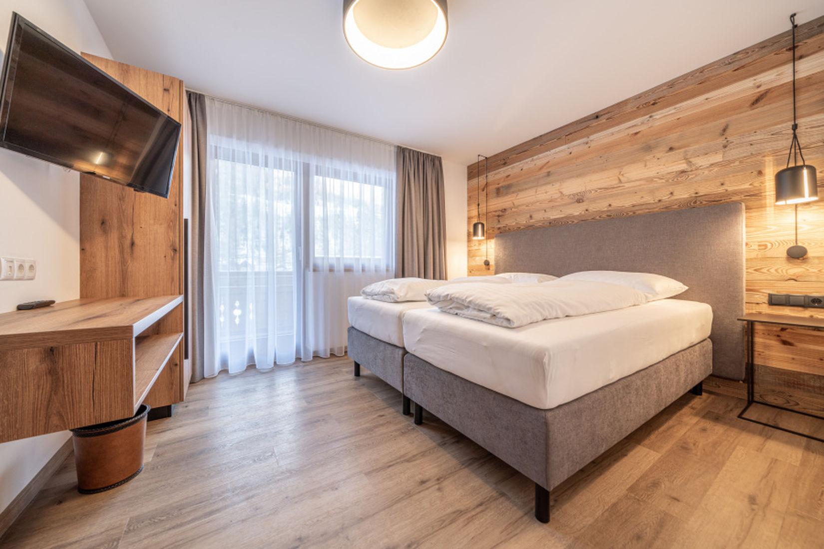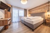 Gemütliches Doppelzimmer Arnika im modernen, alpinen Stil. Modernes Boxspringbett und gemütliches Sofa. Smart-TV und Safe. Badezimmer mit Regendusche, WC, Handtuchtrockner und Fön. Balkon mit Bergblick. Größe ca. 27 m²