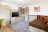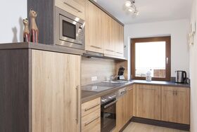 1 Doppelzimmer, 2 Dreibettzimmer (Doppelbett & ein Einzelbett), 2 Zimmer mit Balkon, Flat-TV; 3 Badezimmer mit Kosmetikspiegel und Haarfön (1 x Badewanne/WC, 2 x Dusche/WC). Eine offene Wohnküche mit großzügigem Essbereich und Flat-SAT-TV, abgeteilter Küchenblock mit Cerankochfeld, Backofen, Geschirrspüler, Mikrowelle, Kühlschrank mit kleinem Gefrierfach, Nespresso- & Filter-Kaffeemaschine, Toaster, Wasserkocher und Zugang zum Balkon.