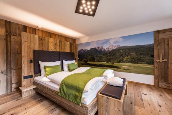 Erholen Sie sich in unserer Golf Suite mit hochwertigem Komfort. Mit Naturmaterialien wie Altholz und Loden haben wir die Golfsuite gestaltet. Viel Freiraum rund ums Bett, Sat-TV und dem einmaligen Panoramablick vom privaten Balkon genießen.