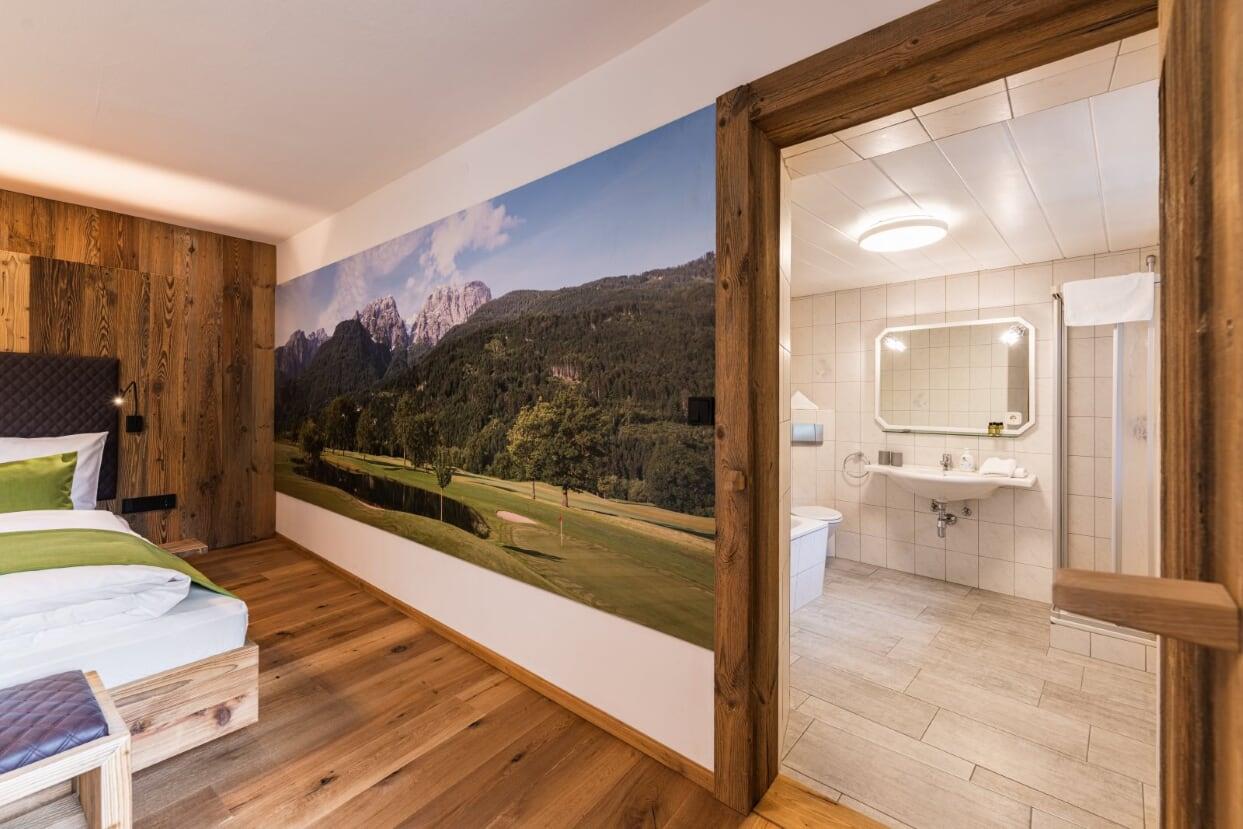 Erholen Sie sich in unserer Golf Suite mit hochwertigem Komfort. Mit Naturmaterialien wie Altholz und Loden haben wir die Golfsuite gestaltet. Viel Freiraum rund ums Bett, Sat-TV und dem einmaligen Panoramablick vom privaten Balkon genießen.