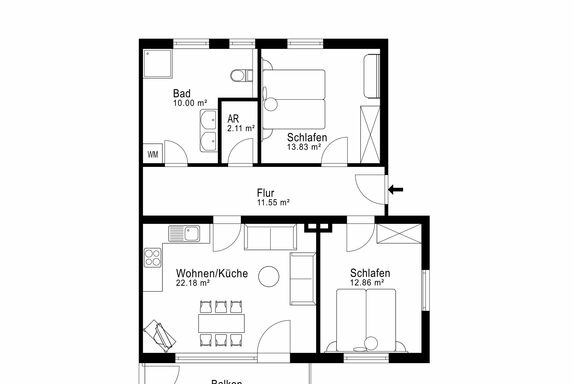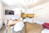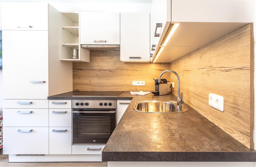 Große Wohnküche mit komplett ausgestatteter Markenküche, 2 ruhige Doppelschlafzimmer, großes, modernes Badezimmer mit Doppelwaschtisch/Dusche/WC, Gemeinschaftsbalkon