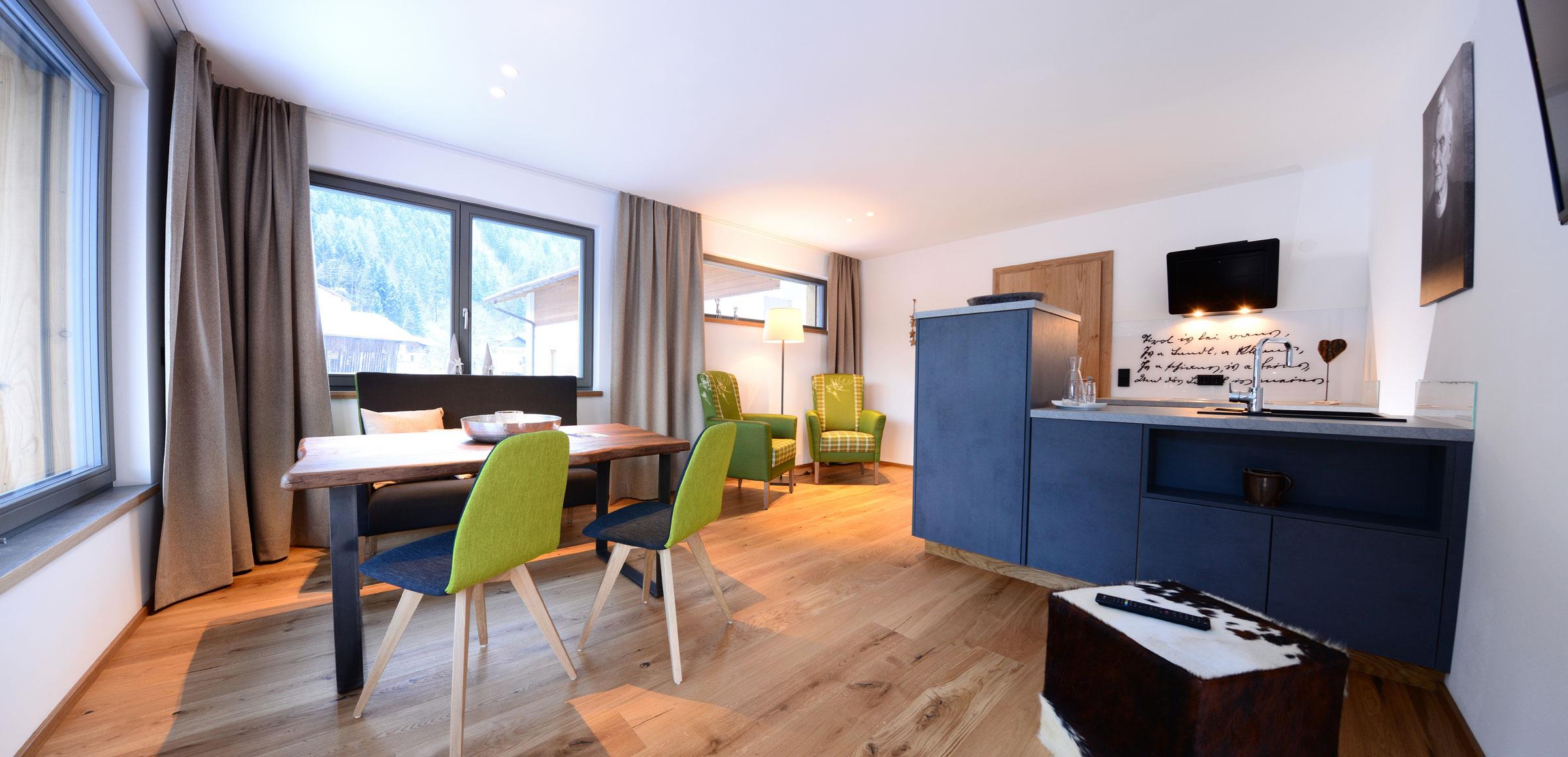 Das Leben genießen… Relaxen am Naturbadeteich, am Abend auf der Terrasse die Osttiroler Bergwelt bewundern und in den hochwertigen Apartments die Seele baumeln lassen. Bei einer Auszeit lässt sich das Leben in vollen Zügen genießen! In den drei hochwertigen, stilvollen Apartments mit vielen Naturmaterialien und Terrasse/Balkon mit Blick zum Pool können Sie es sich gut gehen lassen! In die Sonnenstadt Lienz und zum Dolomitengolfplatz Lavant sind es nur wenige Minu