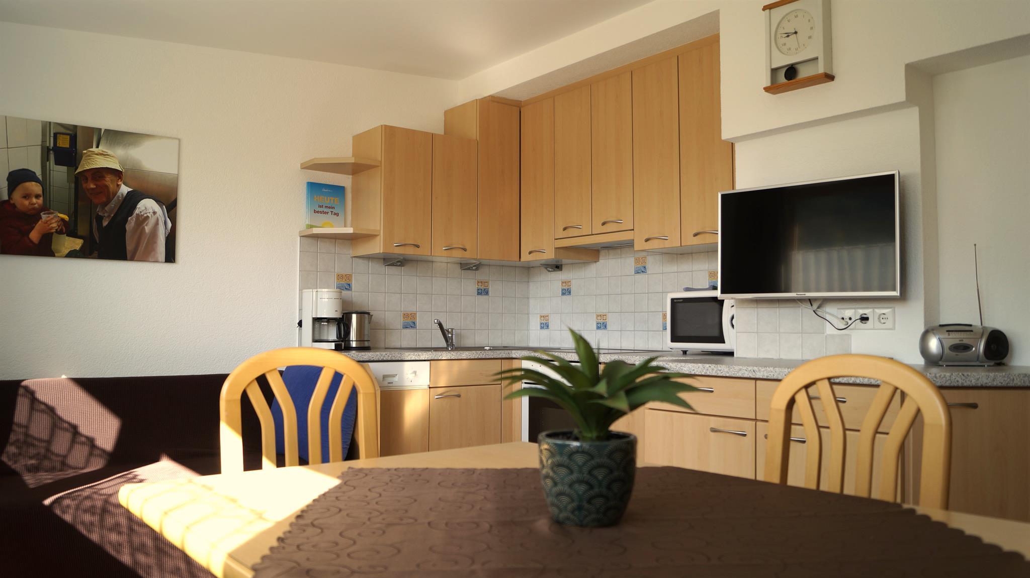 Top ausgestattete, gemütlich helle Ferienwohnung in ruhiger Lage mit geräumiger Wohnküche (mit Sat-TV, Microwelle, Geschirrspüler, Internetzugang..), 2 Schlafzimmern, Bad und WC.