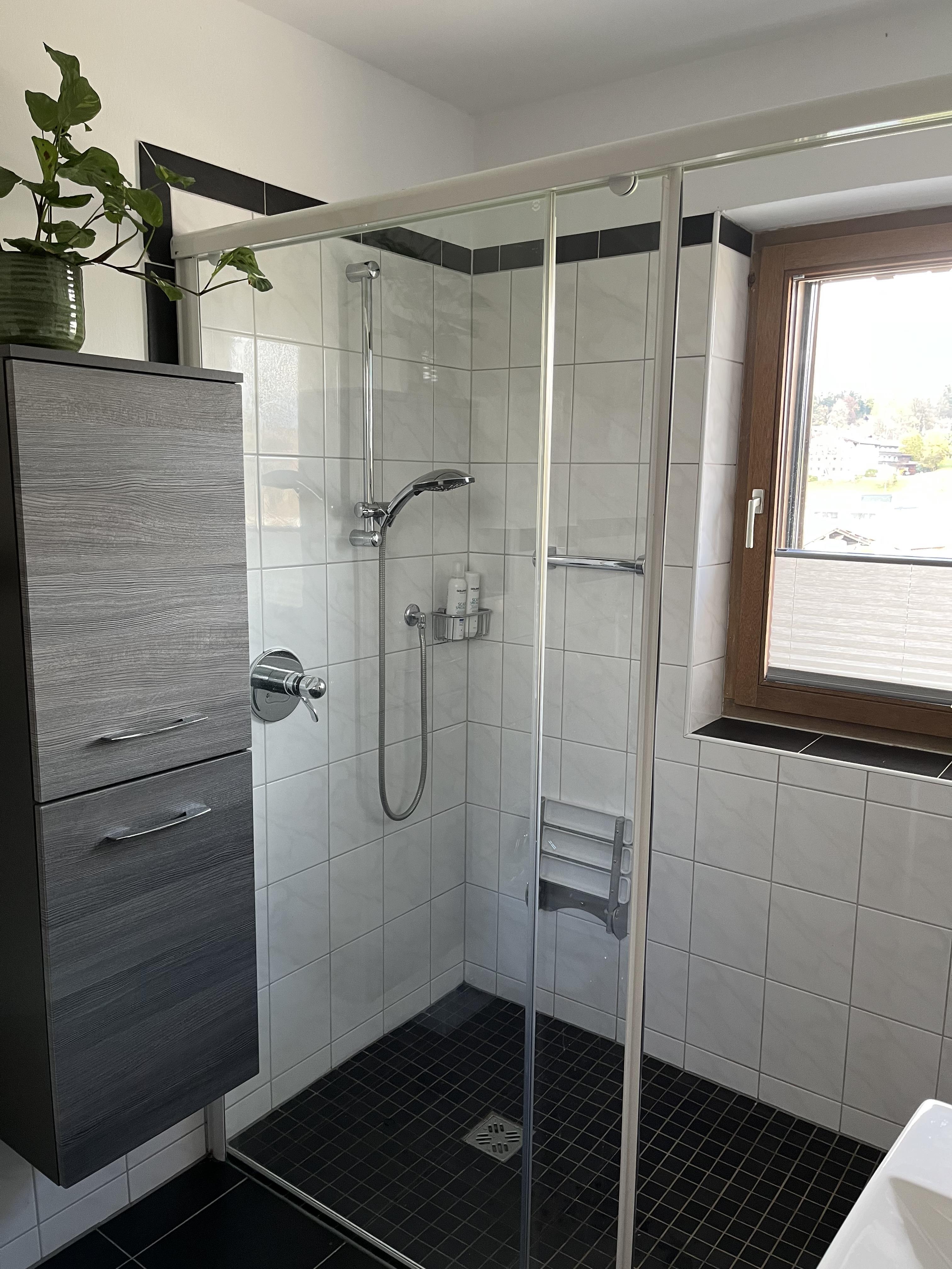 Das Badezimmer verfügt über einen großen Duschbereich, WC, Bidet, Föhn und genügend Stauraum.
