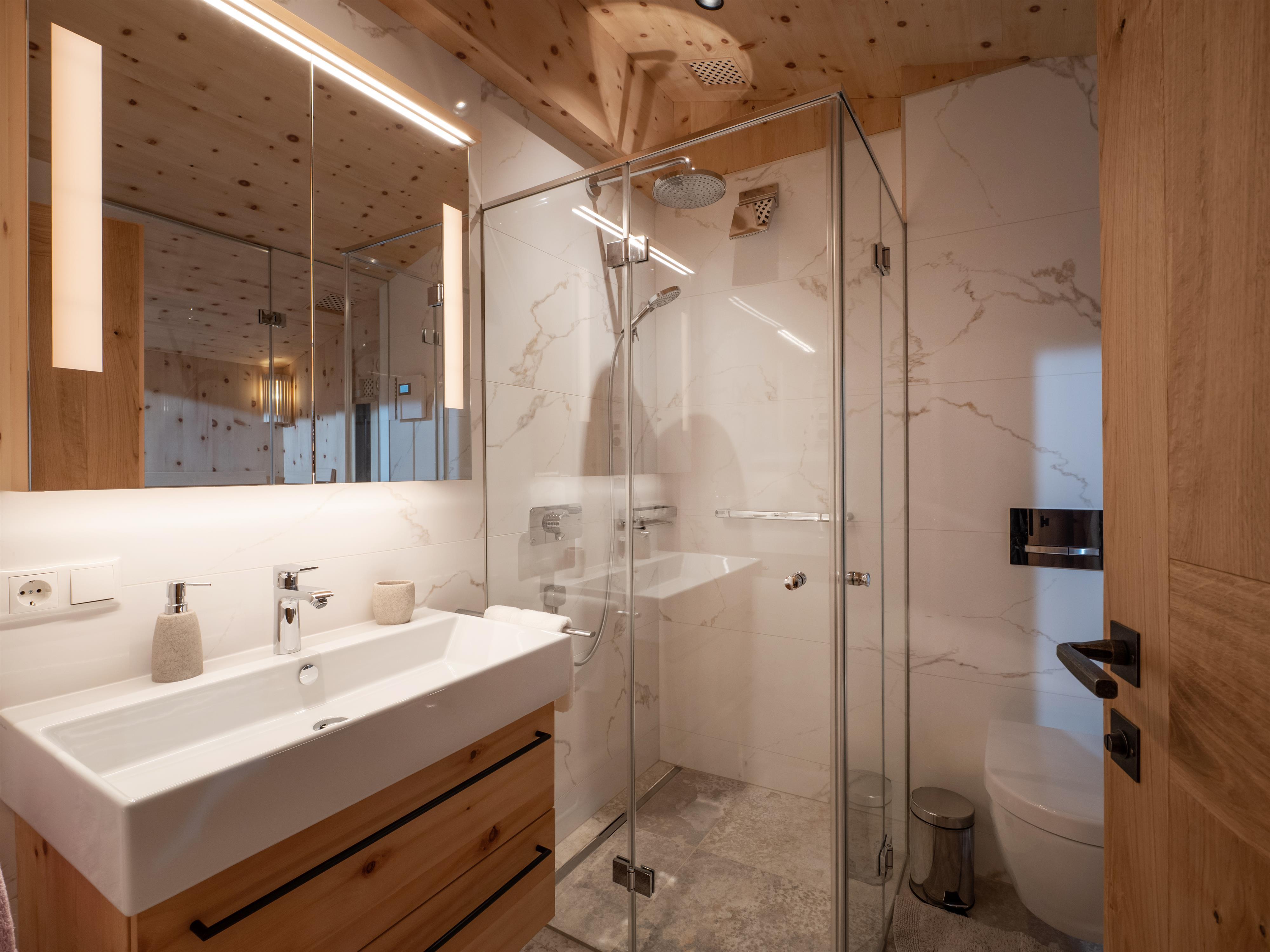 Badezimmer mit Regendusche und Zugang zur Zirbensauna und Infrarot-Rückenstrahler