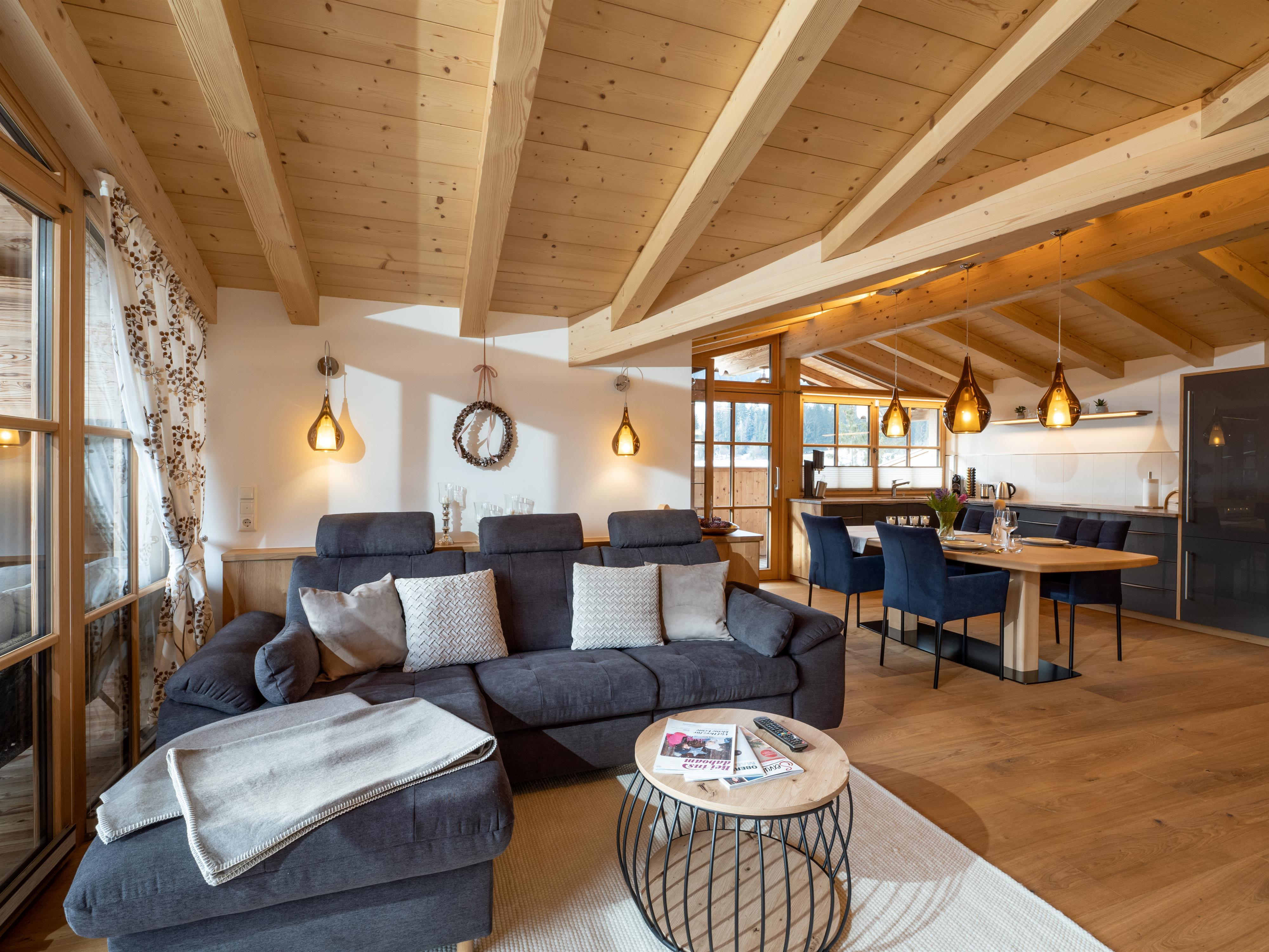 Wohnzimmer mit Full-HD-TV und Soundsystem, Wohlfühlcouch und Blick auf das Kitzbüheler Horn