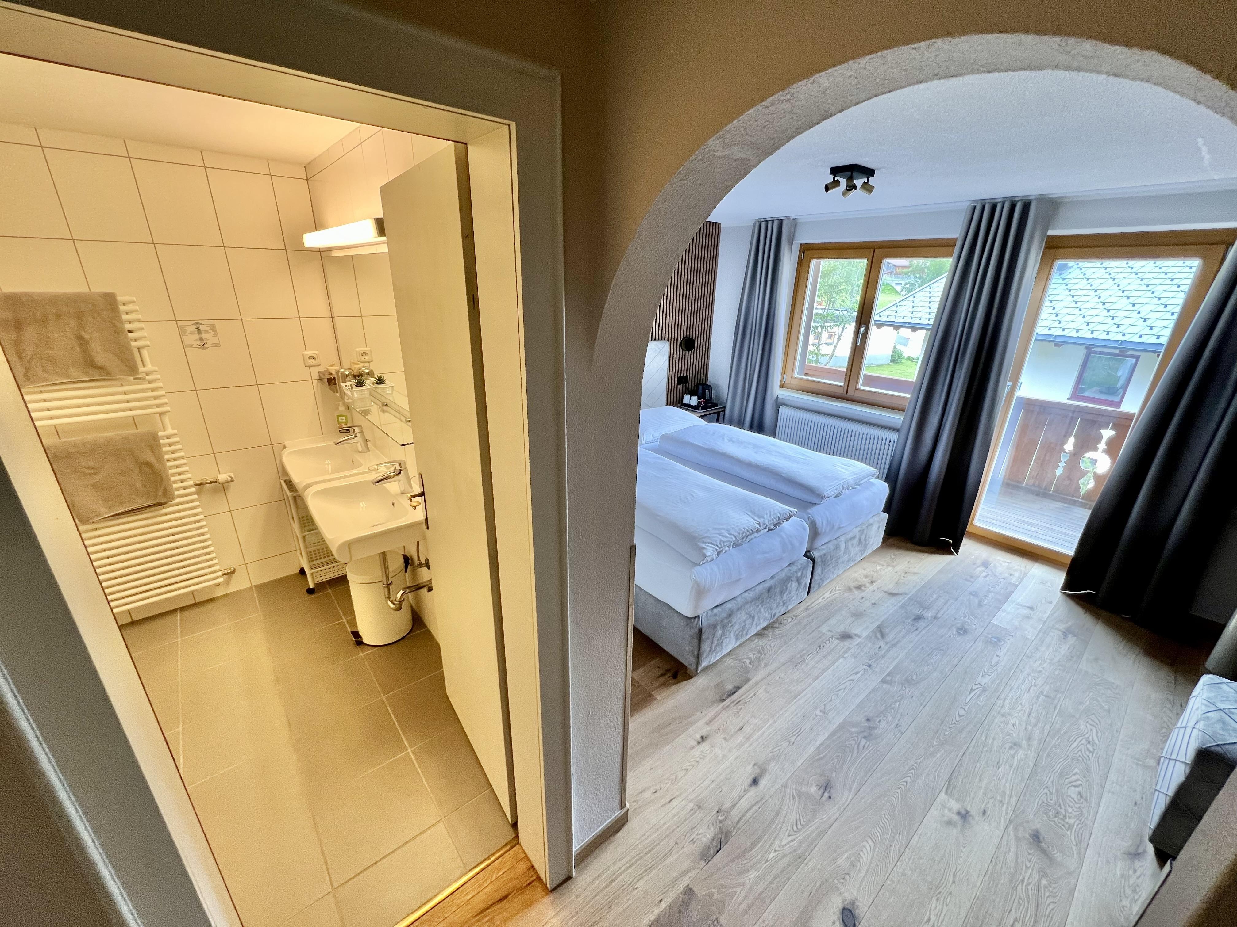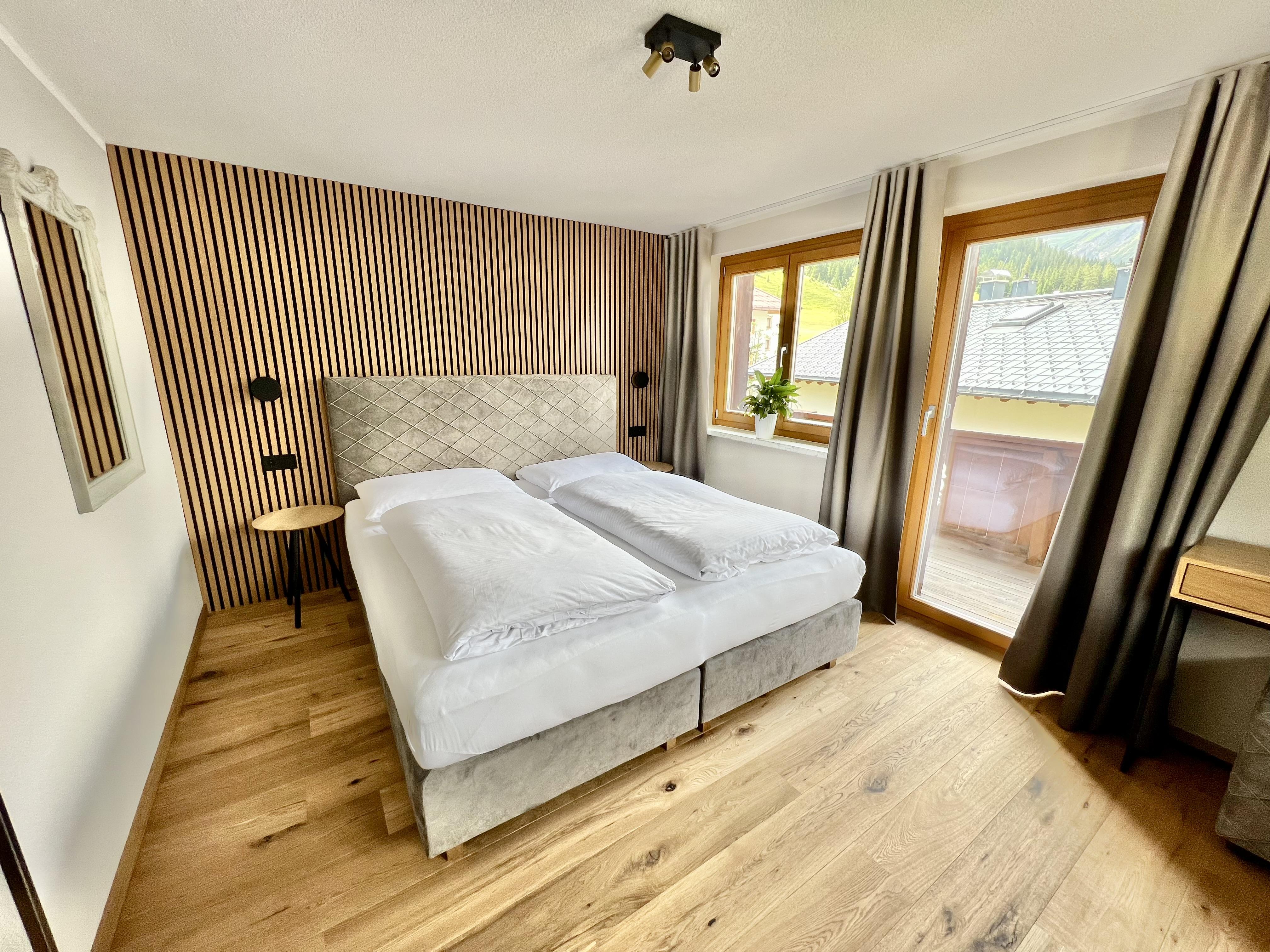 Doppelzimmer mit Doppelbett, Schreibtisch, Kabel-TV, Radio, Telefon. Badezimmer mit Badewanne/Dusche und WC. Haarfön, Kosmetikspiegel. Gemütliche alpine Möblierung mit hellem Holz (manche Zimmer mit dunklem Holz). Freundliche Stoffe und warme Farben. Schöner Blick nach Lech.