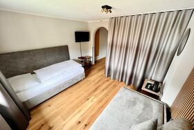 Einzelzimmer mit Einzelbett, Schreibtisch, Kabel-TV, Radio, Telefon. Badezimmer mit Dusche und WC. Haarfön, Kosmetikspiegel. Gemütliche alpine Möblierung mit hellem Holz (manche Zimmer mit dunklem Holz). Freundliche Stoffe und warme Farben. Schöner Blick nach Lech.
