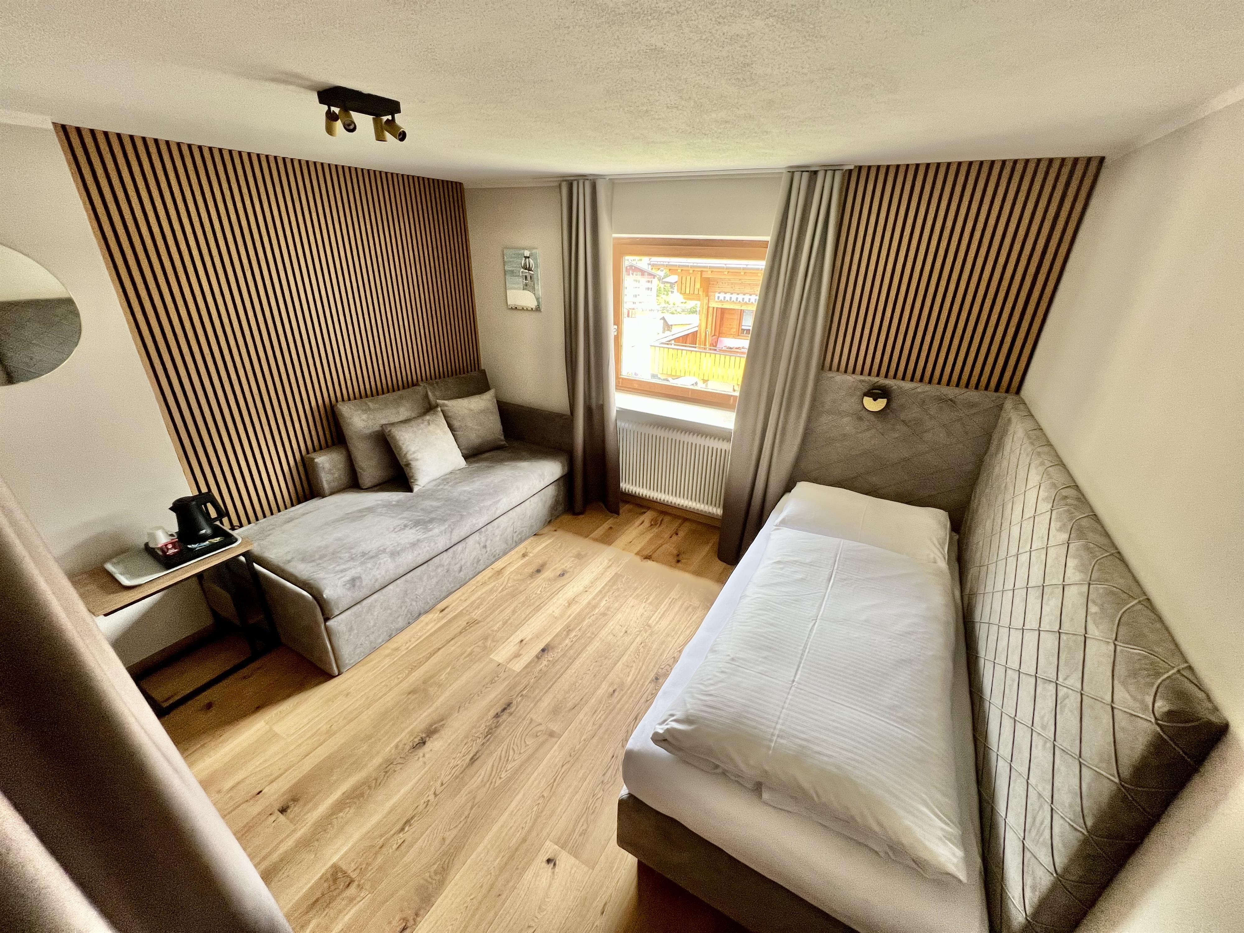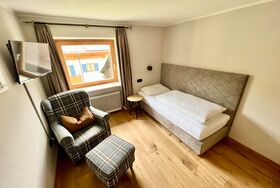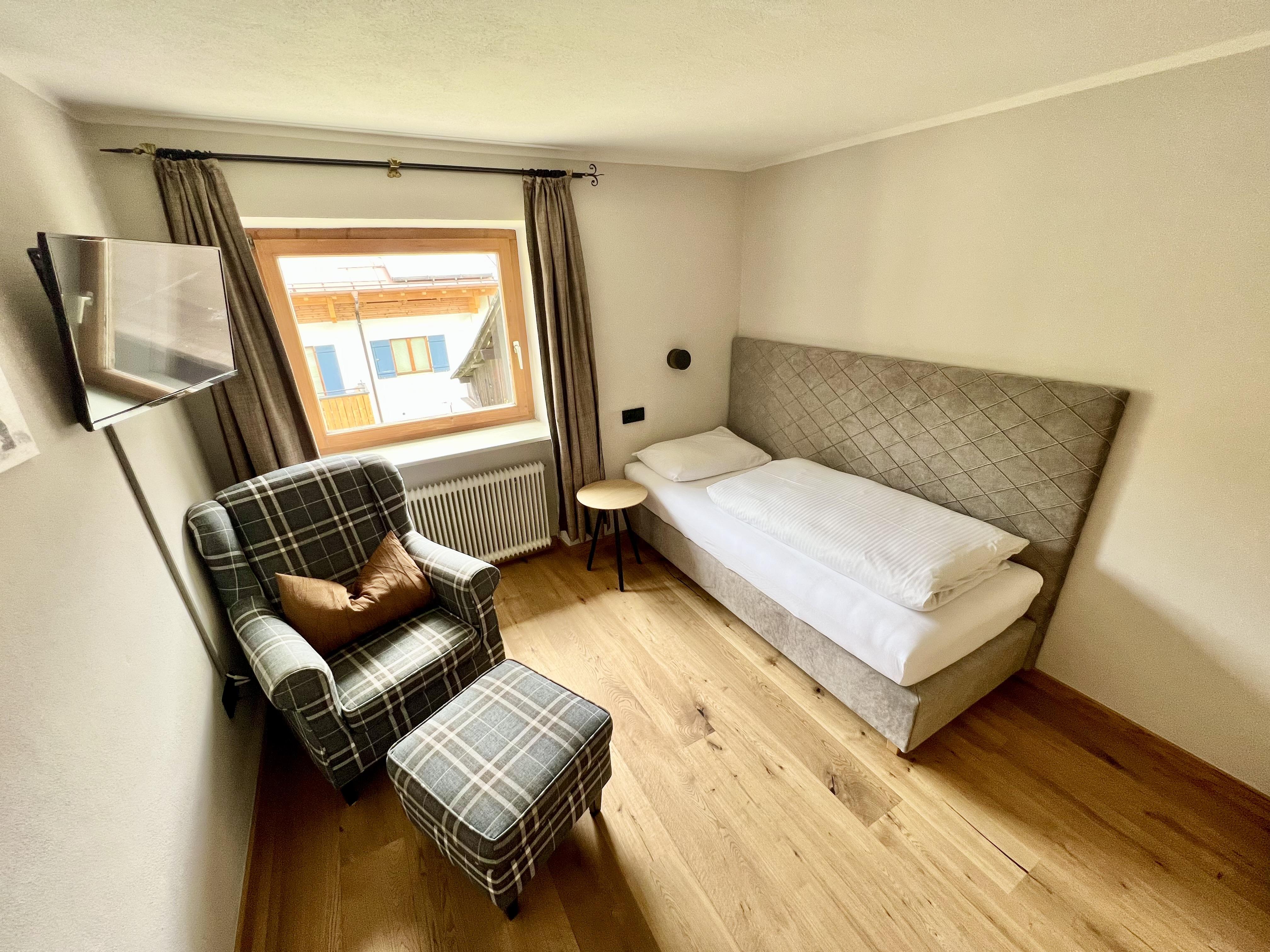 Einzelzimmer mit Einzelbett, Schreibtisch, Kabel-TV, Radio, Telefon. Badezimmer mit Dusche und WC. Haarfön, Kosmetikspiegel. Gemütliche alpine Möblierung mit hellem Holz (manche Zimmer mit dunklem Holz). Freundliche Stoffe und warme Farben. Schöner Blick nach Lech.