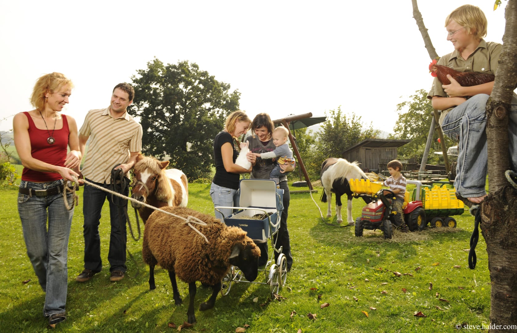 Wir sind ein landwirtschaftlicher Vollerwerbsbetrieb mit Jungrindern/Kühe und vielen Kleintieren (Hasen, Ponys, Ziege, ...). Unser überdachtes Schwimmbad, Spielplatz, Riesensandhaufen, Trampolin, Tischtennis, Go-Kart, Rutschautos, Spielesammlung und Spielräume für verschiedene Altersgruppen warten darauf von Euch entdeckt zu werden.