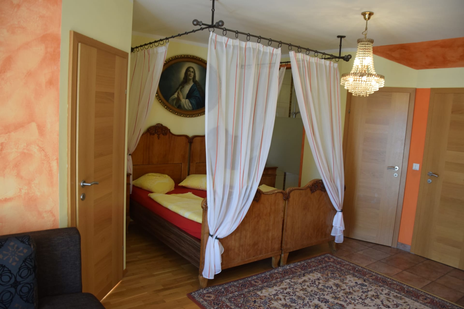 Diese klimatisierte, im Almhüttenstil gestaltete Suite (65 m²) ist mit vielen Extras wie Steinbogeneingang in die Duschhalle und selbstgebauten Möbeln ausgestattet.