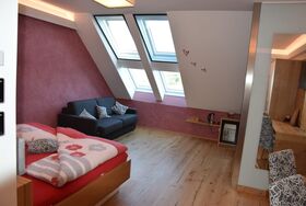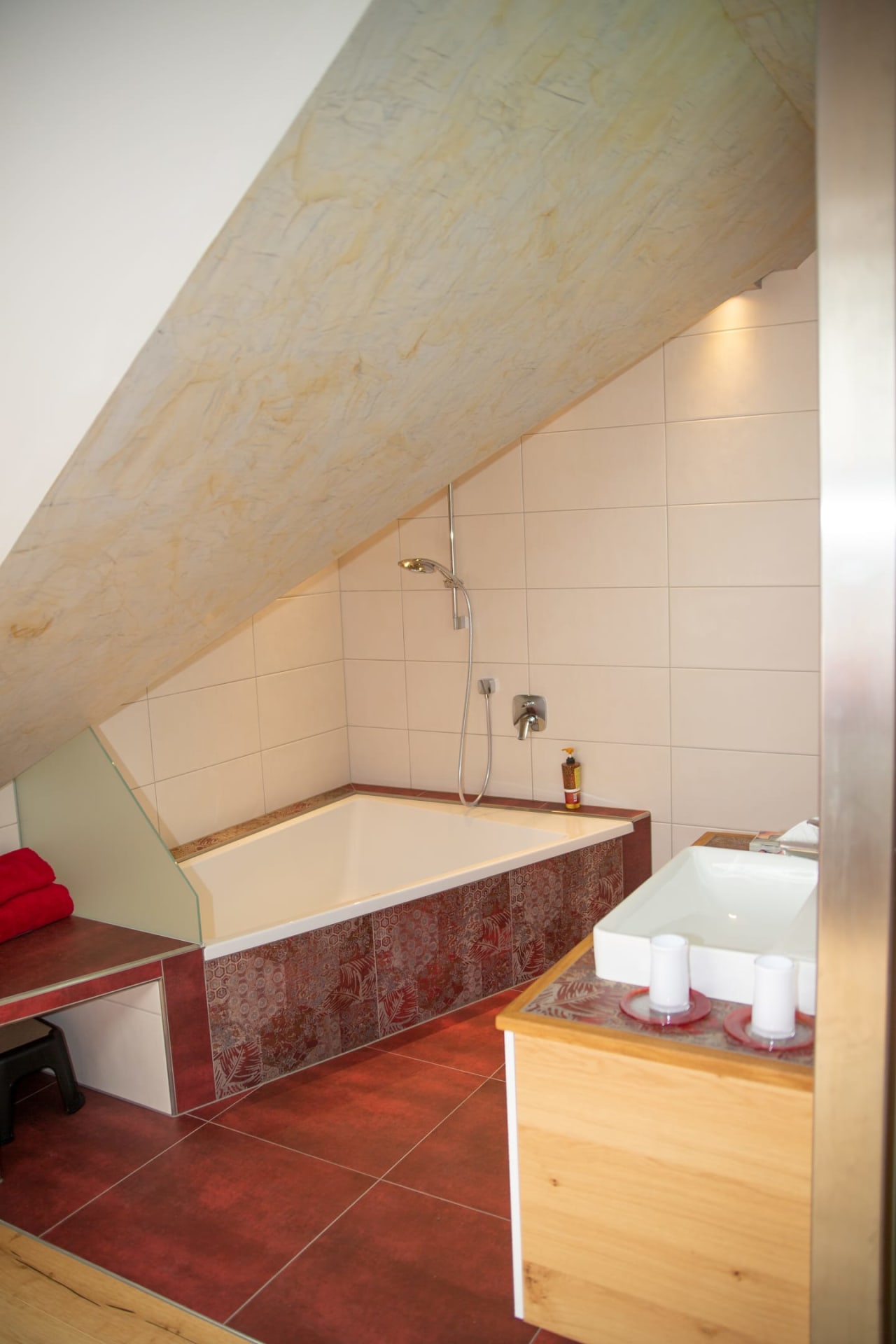 Das klimatisierte, 38m³ große Zimmer lädt zu einem gemütlichen, romantischen Aufenthalt ein. In der großzügigen Doppelbadewanne könnt Ihr den Tag ausklingen lassen. Ein Besonderheit ist die individuell steuerbare Beleuchtung des Zimmers. Vom Sofa aus könnt Ihr den Sternenhimmel beobachten. Elektrische Rollos zur Verdunklung der Räume sind ebenfalls vorhanden.