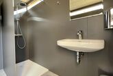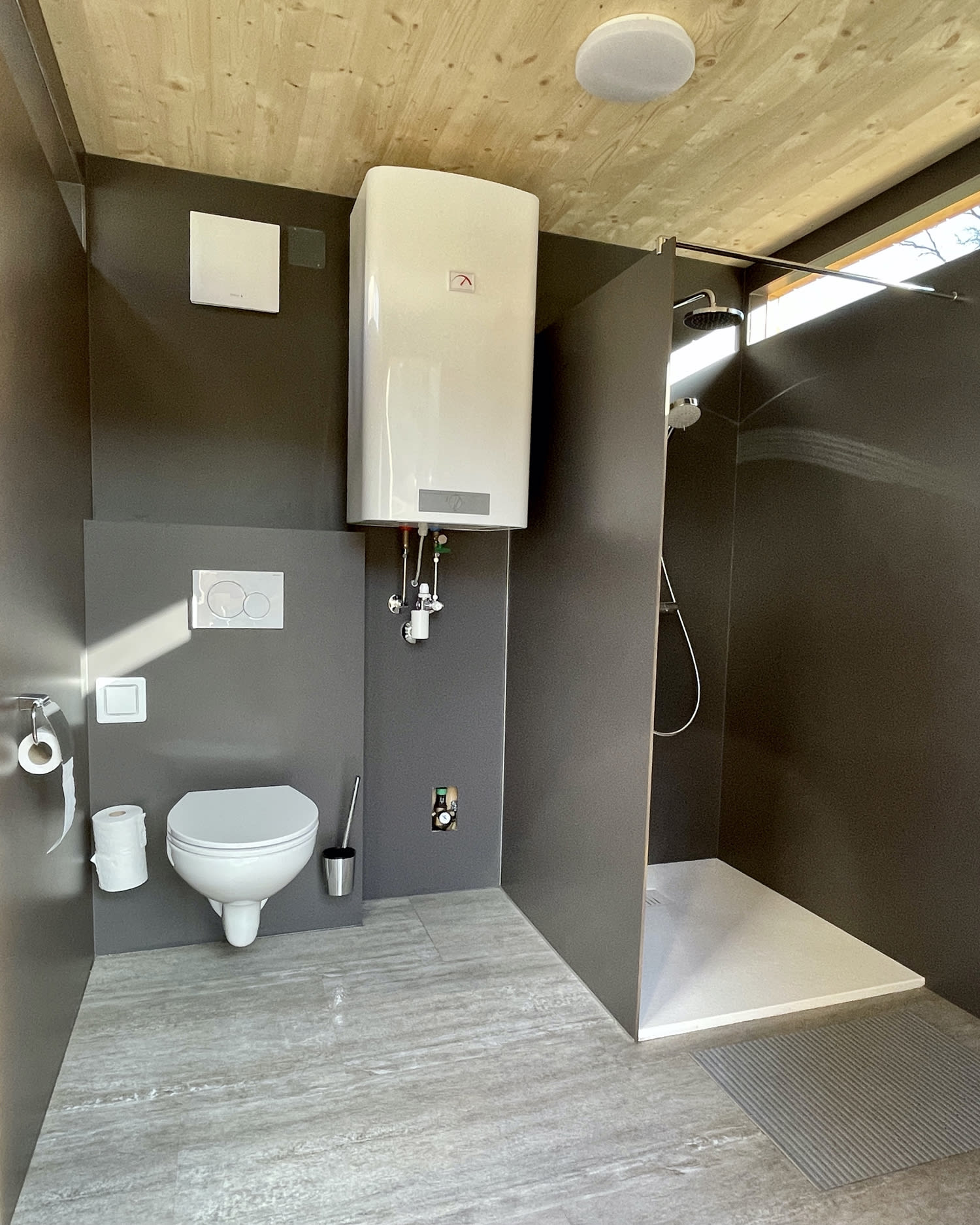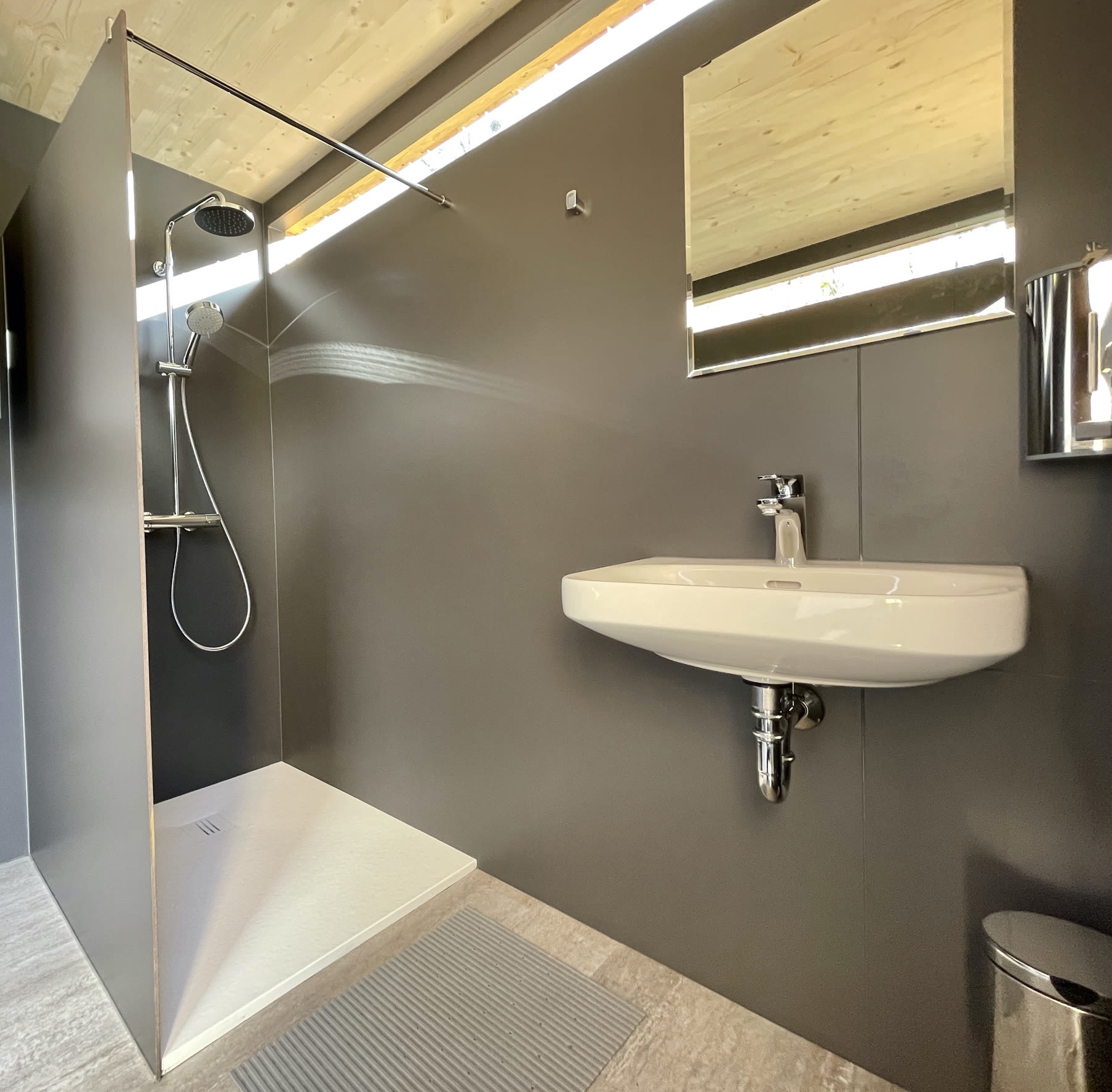 Die (Gemeinschafts-)Sanitärbox und ein WC-Container sind von jeder Schlafbox bequem zu erreichen. Modern und mit dem Wichtigsten eingerichtet - Dusche, WC, Spiegel und Haken - glänzt die CHECKIN THE BOX Sanitärbox mit Sauberkeit, hohen Standards und Funktionalität.