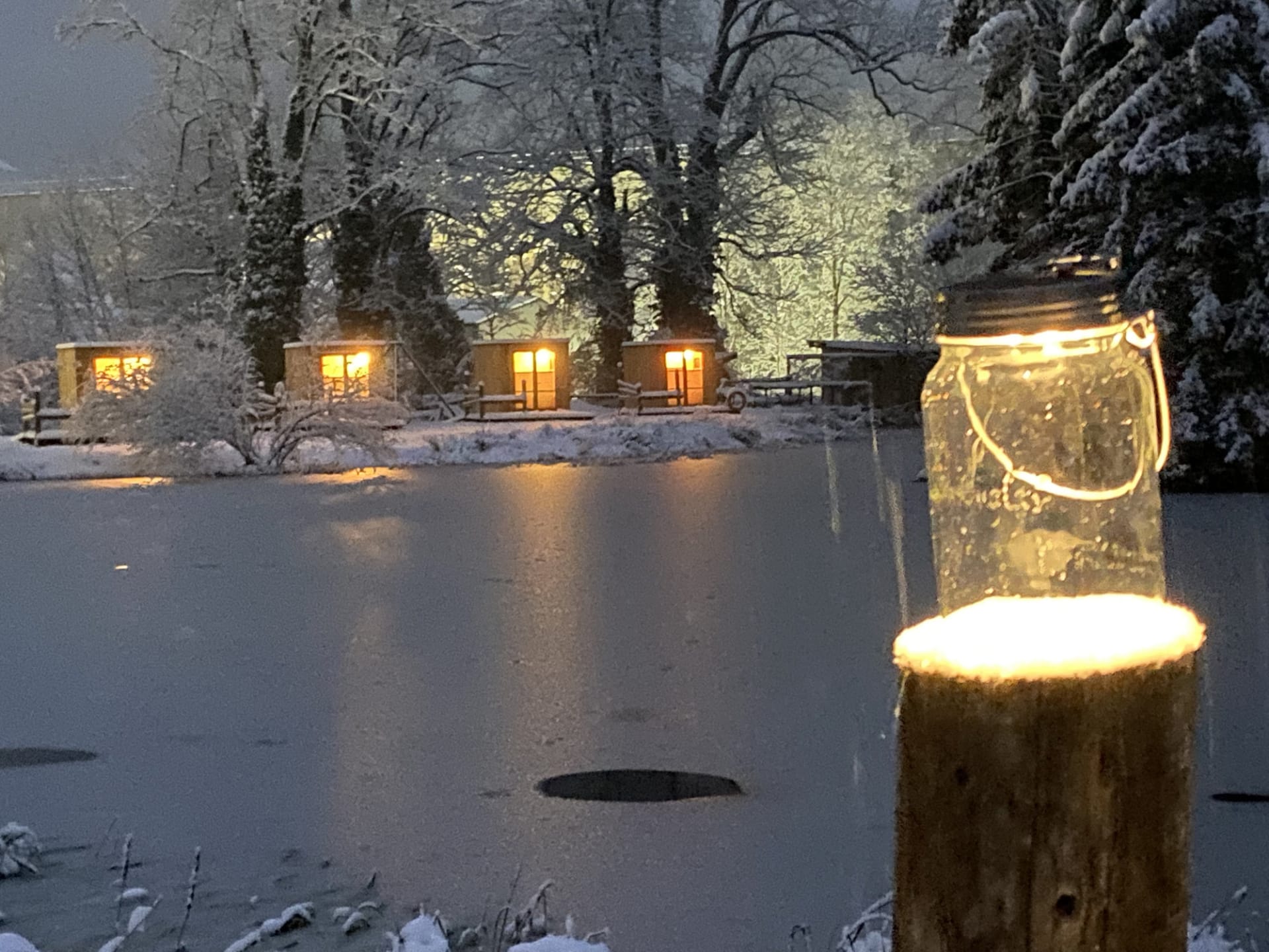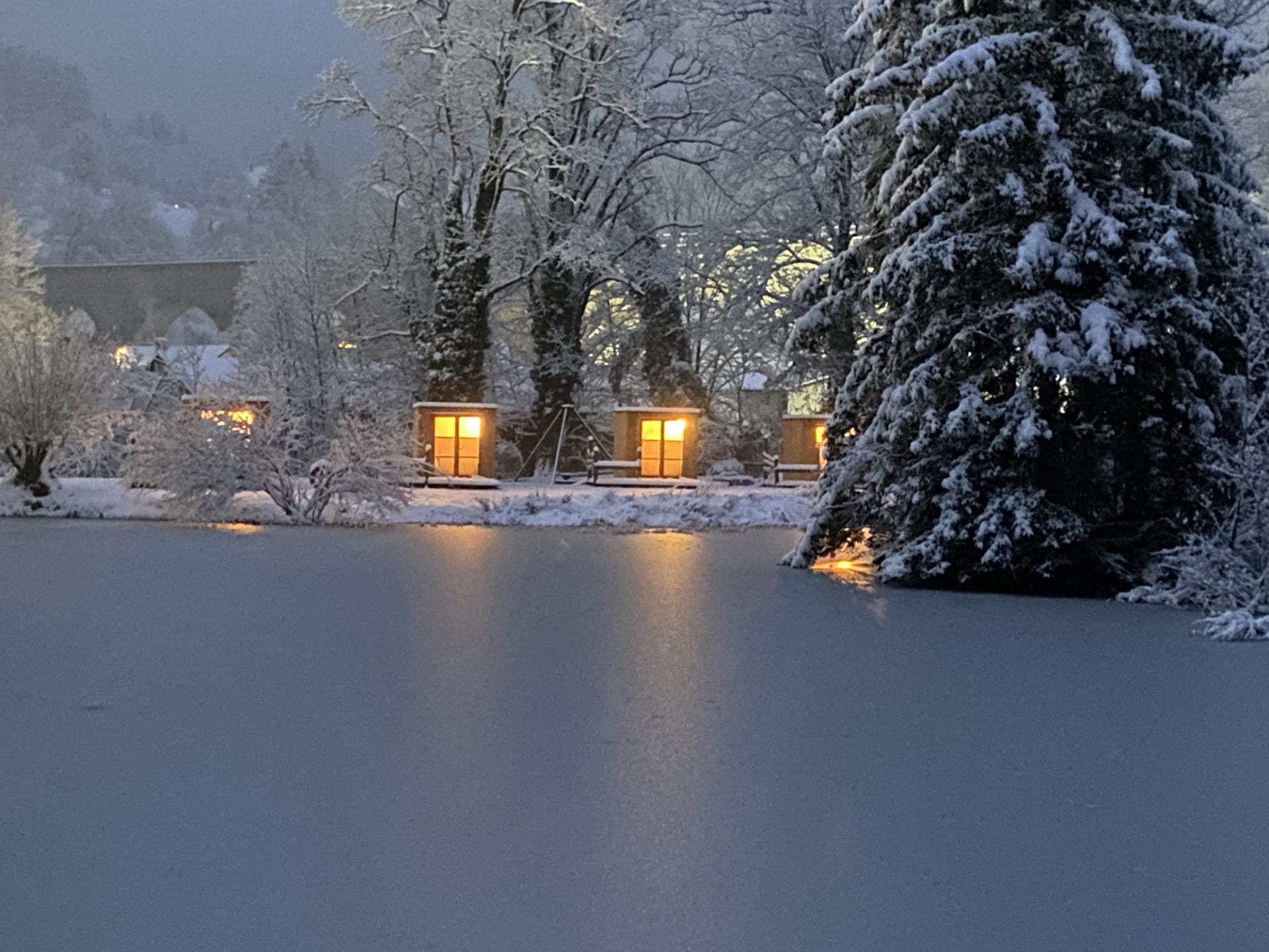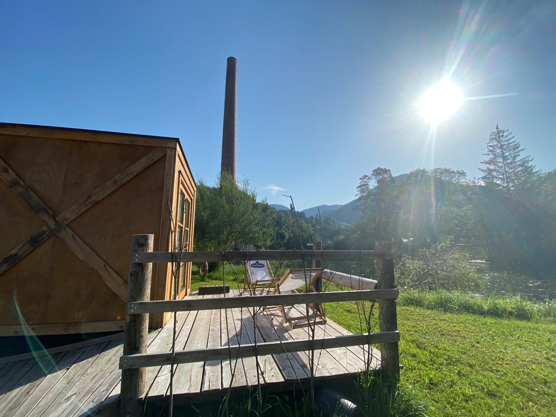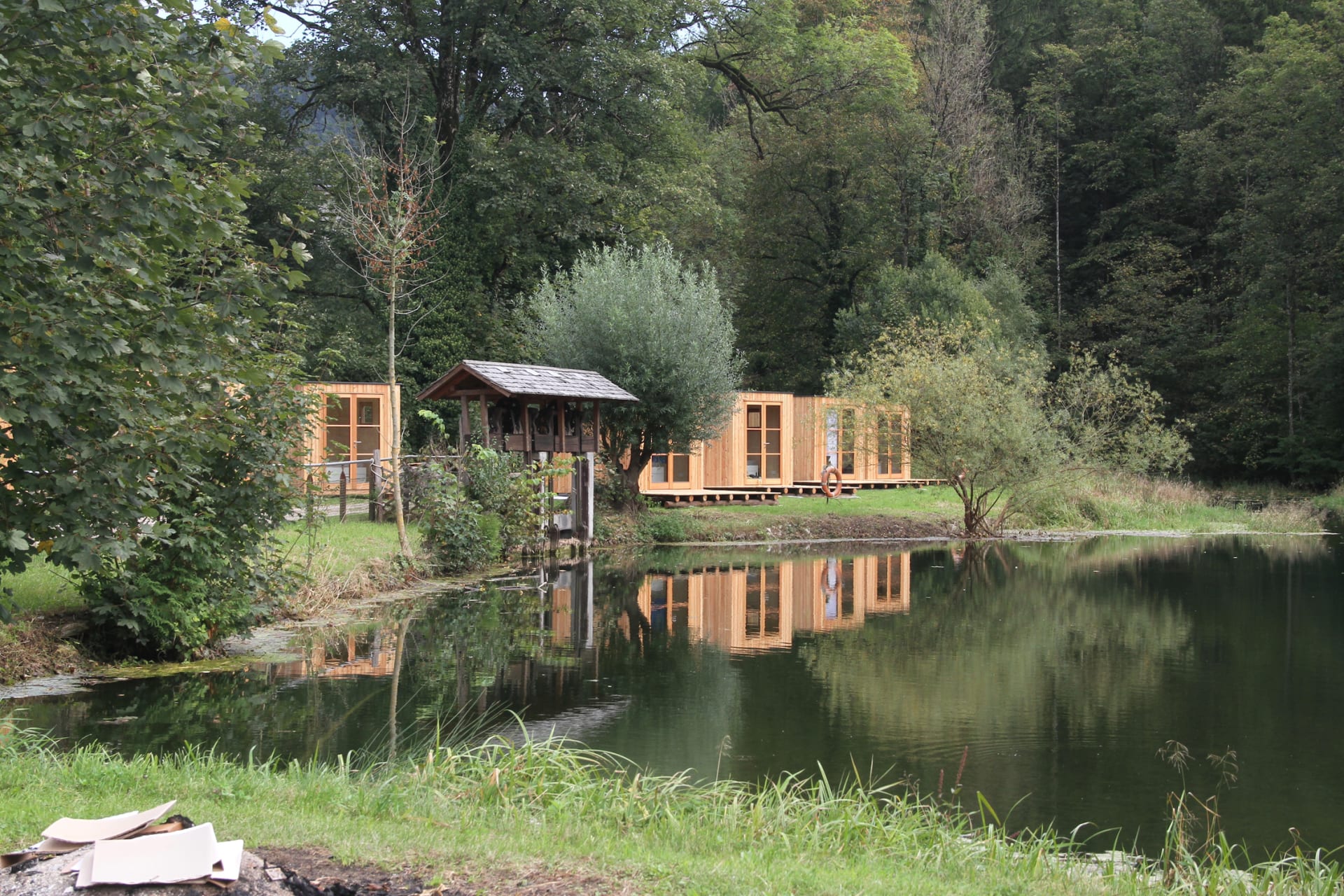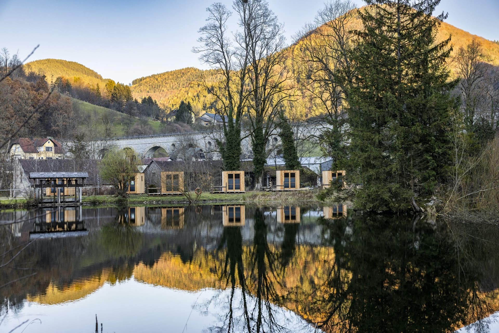 6 CHECKIN THE BOX Schlafboxen liegen auf dem idyllischen Teichareal der ehemaligen Papierfabrik Neubruck – mit Blick in die Natur und auf das Töpperschloss.
