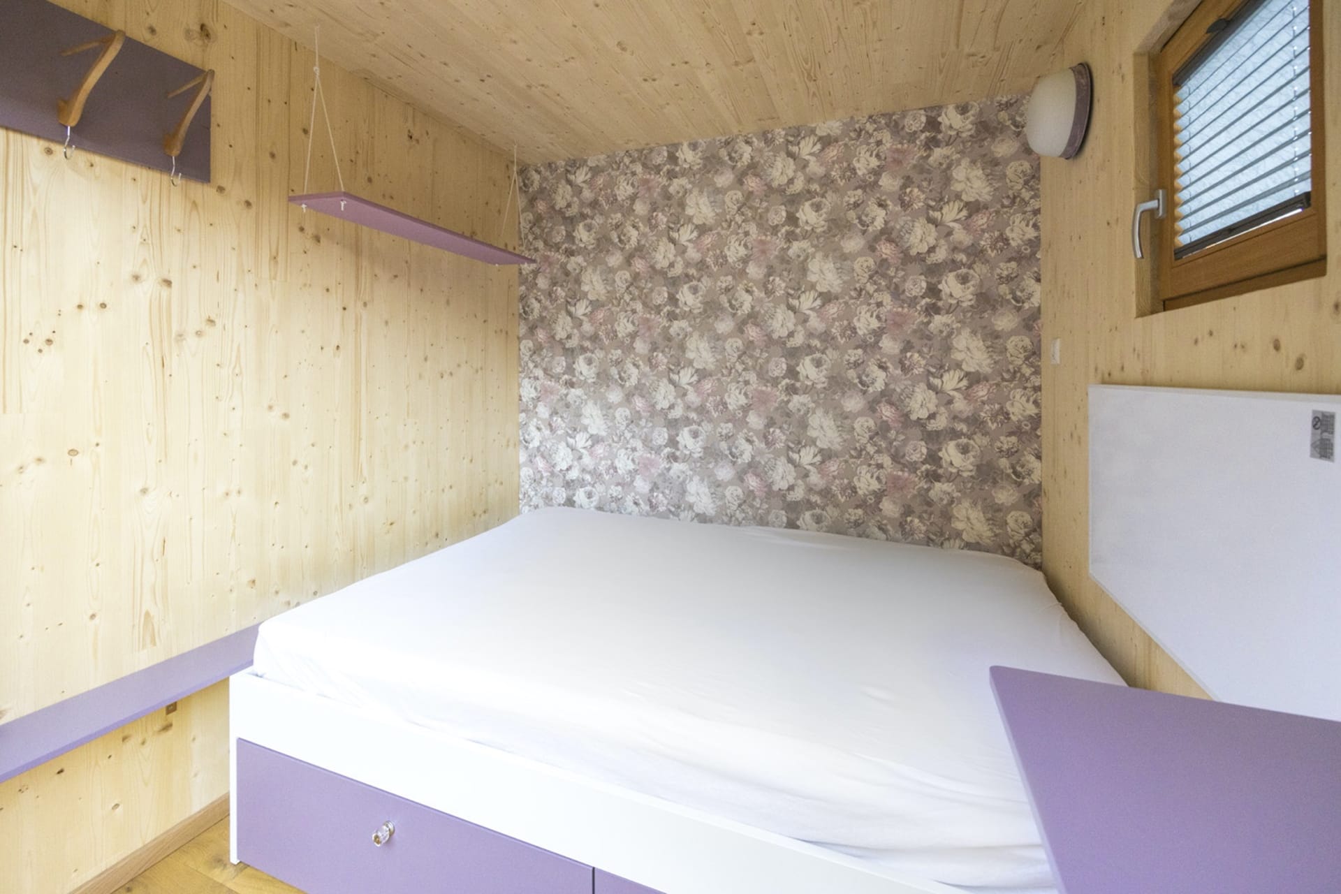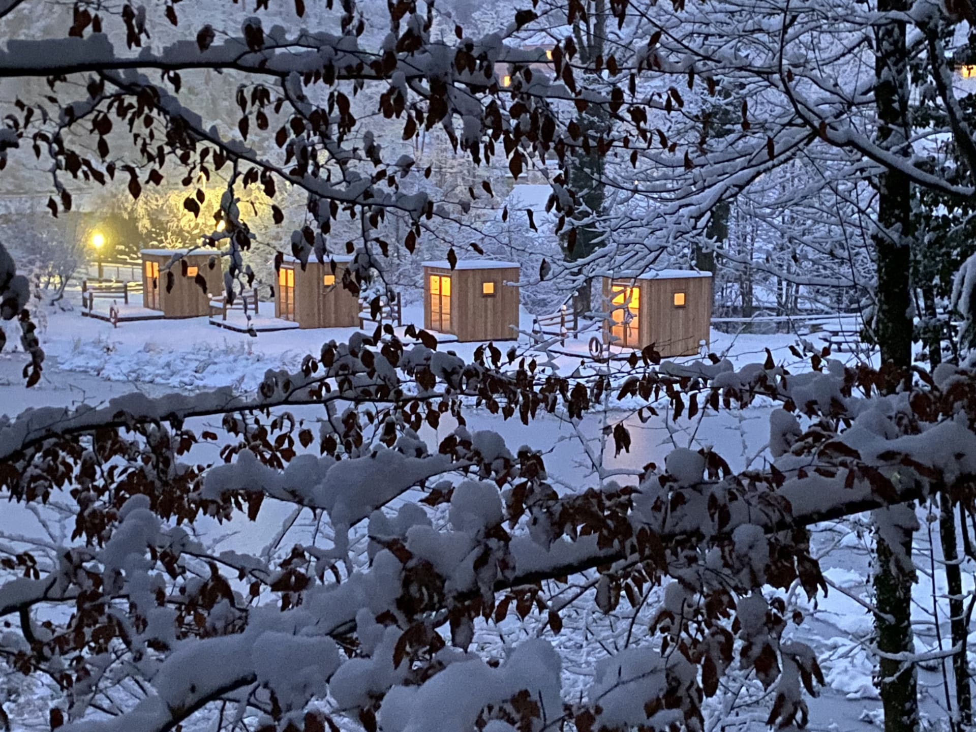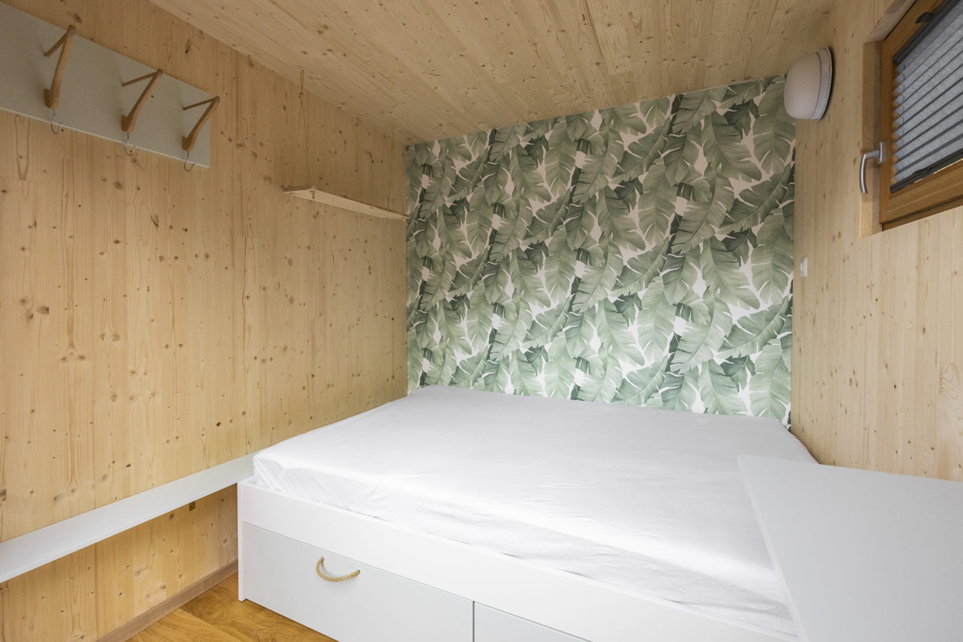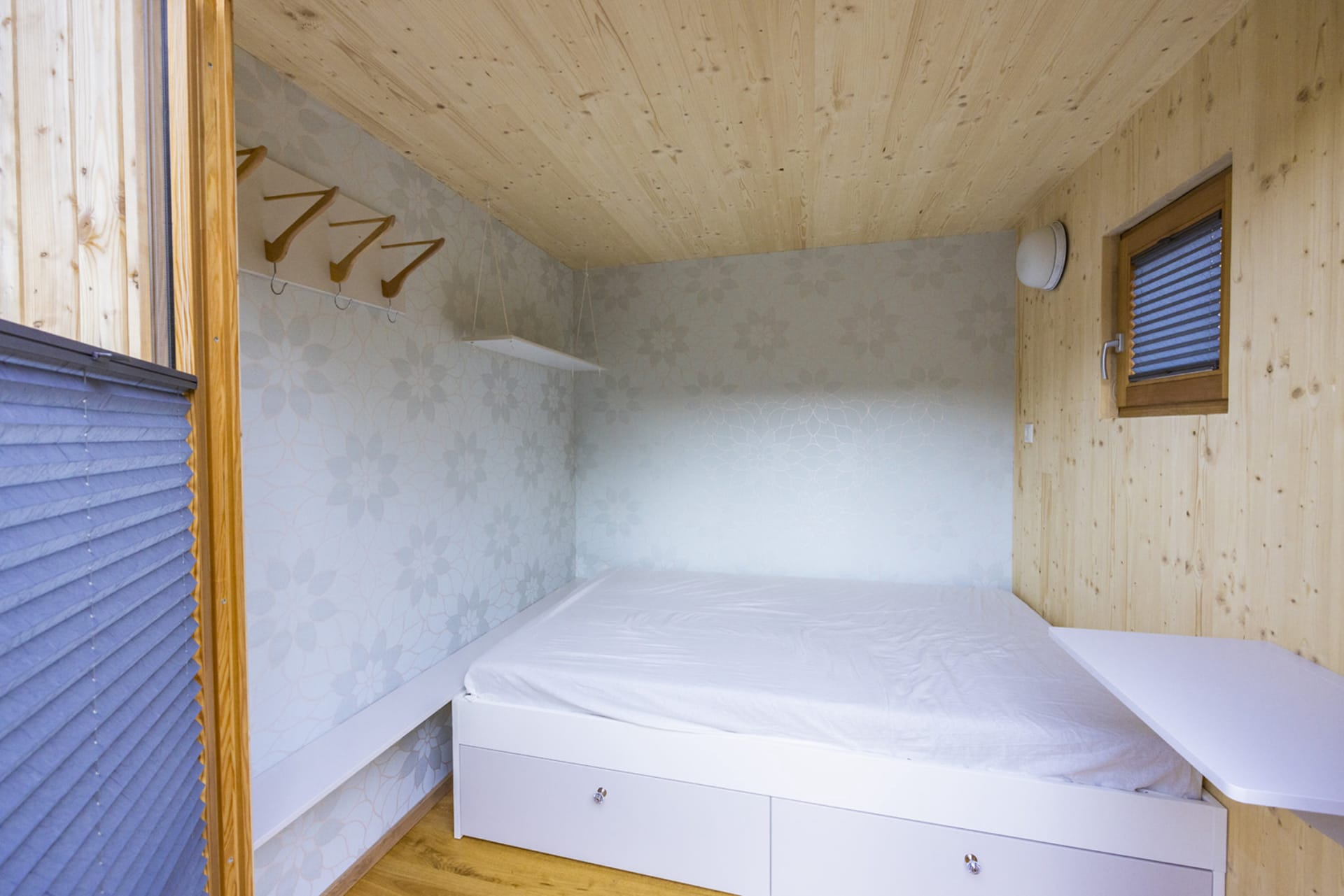 Die Schlafboxen aus Holz sind minimalistisch und durchdacht ausgestattet – mit Bett, Stauraum, Ablagen und Infrarotheizung für kühle Tage. Der Fokus liegt auf dem Wesentlichen: gut schlafen, draußen sein, durchatmen.