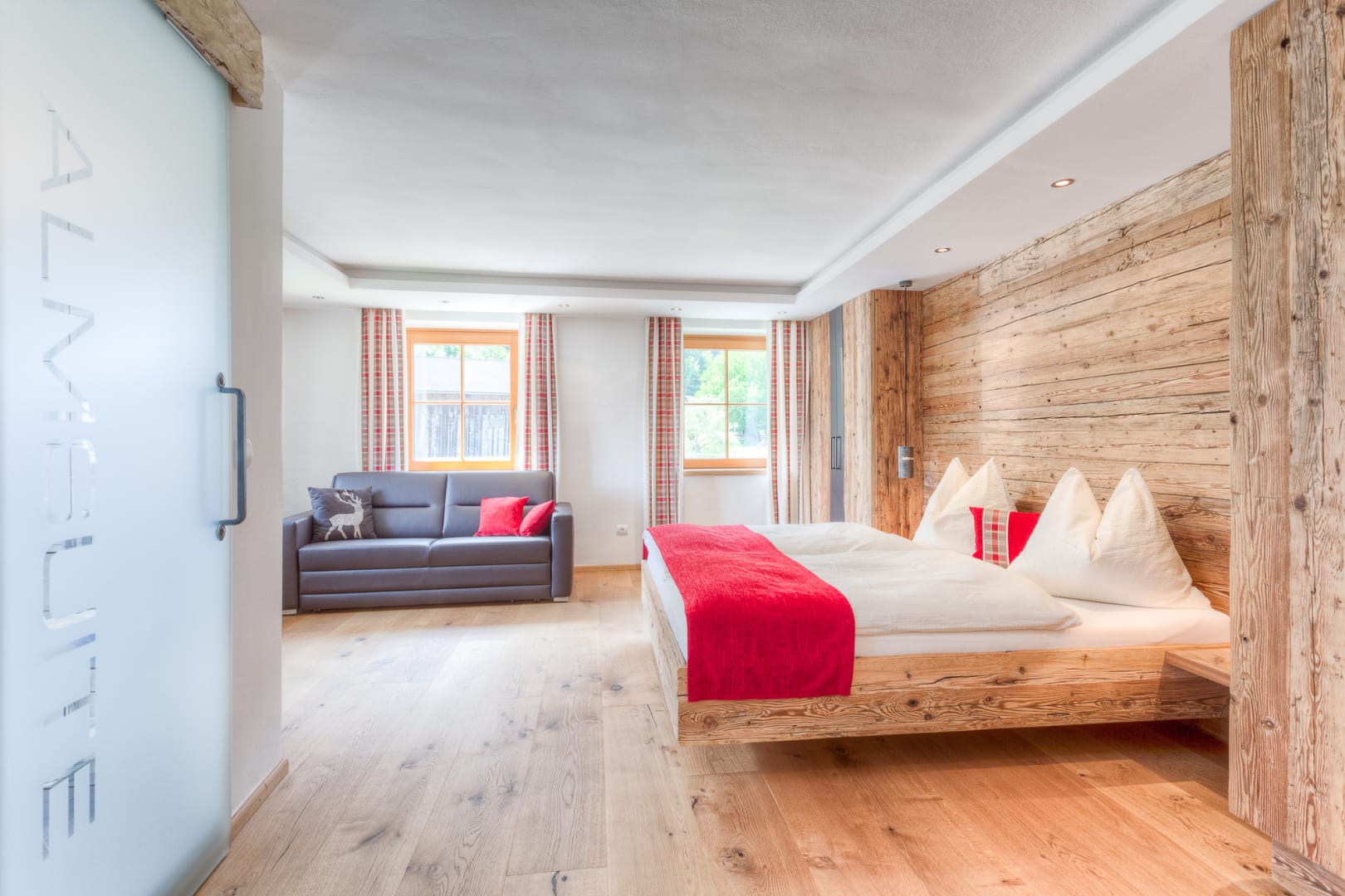 Einfach Urlaub machen! Die Almsuite ist ausgestattet mit einem sonnendurchfluteten Badezimmer mit Dusche und WC, einem großzügigem Schlafzimmer mit Vollholz-Doppelbett und Parkettboden, einer gemütlicher Wohnlandschaft mit Sitzgruppe, Sat-TV und WLAN.