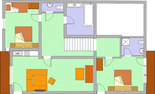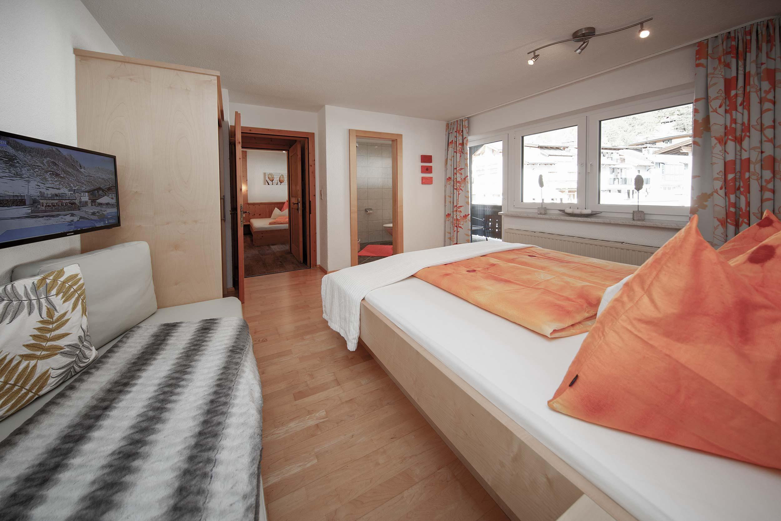 Rustikal ausgestattetes Appartement mit 1 Doppelzimmer (1 davon mit Flat-TV), 1 Dreibettzimmer , 2 Badezimmer (1x Dusche/WC und 1x Bad getr. WC). Wohnküche mit gemütlicher Sitzecke und Ausziehsofa, großer Kabel-Flat-TV, Ost- und Westbalkon.