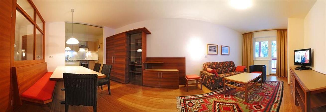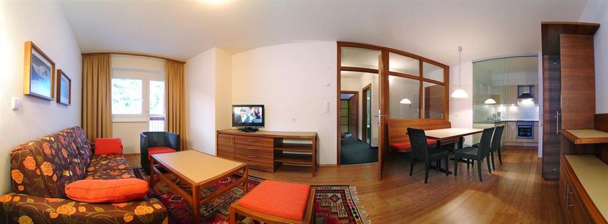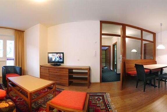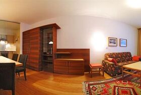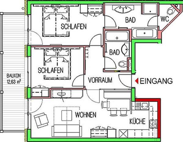 Appartement (ca. 74 m²) für 1-6 Personen. 2 Doppelzimmer; 2 Badezimmern mit Badewanne und/oder Dusche und WC; Vorraum, Wohnküche mit Essecke für 6 Personen sowie Doppelausziehcouch für die 5. und 6. Person und Lehnsessel, E-Herd, Backrohr, Mikrowelle, Spülmaschine, Wasserkocher, Filterkaffee-Maschine, Kühlschrank und entsprechender Ausstattung.
