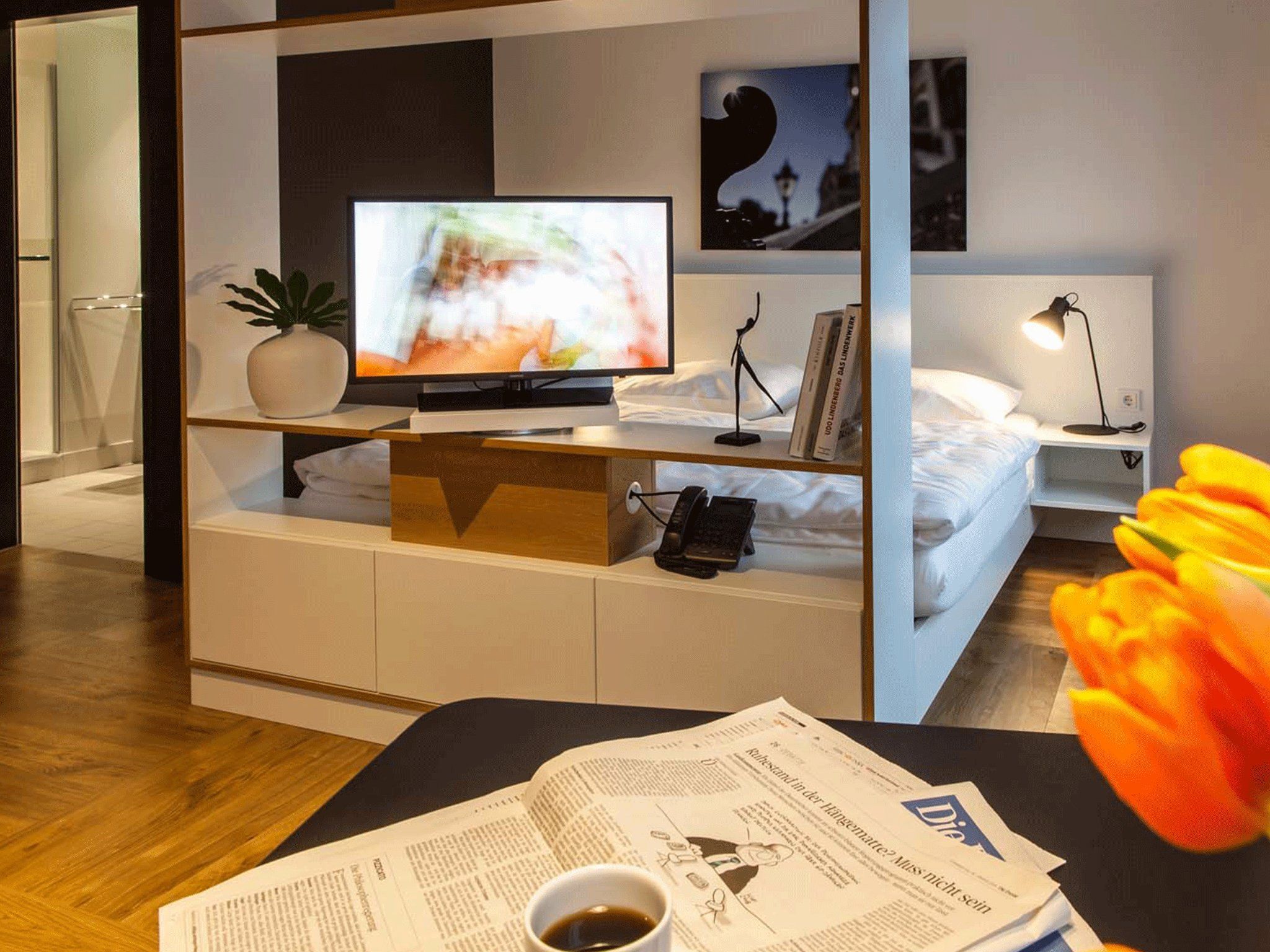 Ihr Zuhause auf Zeit - Perfekt eingerichtet - Vollständig ausgestattet - Unterwegs Zuhause fühlen! Besonders für längere Aufenthalte sind die Apartments eine wohnliche Alternative zum Hotelzimmer. Hier kommen Sie in den Genuss einer durchdachten, hochwertigen und warmen Ausstattung. Dank einer vollständig ausgestatteten Kitchenette (inkl. Ceranfeld, Spüle, Spülmaschine, Nespresso Maschine, Mikrowelle, Wasserkocher, Geschirrset und Besteck, Toaster, uvm.) können Sie eine unbeschwerte Zeit in unseren Apartments genießen.