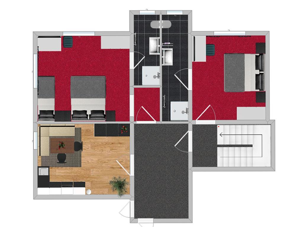 1 Doppelzimmer und 1 Dreibettzimmer (ein Doppelbett und 1 Einzelbett) jeweils mit Kabel-Fat-TV swie 2 Badezimmer mit Dusche/WC, Fön und Kosmetikartikel. Größe ca. 65 m².