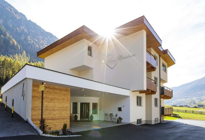 Freuen Sie sich auf unser neues Haus Madeleine mit viel heimischem Holz und Naturmaterialien. Wir bieten besondere herzliche Gastfreundschaft, familiäre Atmosphäre in ruhiger und sonniger Lage, mit herrlichem Panoramablick auf die Bergwelt. Unweit unseres Hauses (ca. 1,2 km) befindet sich die Giggijochbahn mit Zentrum. Die Schibushaltestelle ist nur ca. 20 m vom Haus entfernt und die Busse verkehren im 10 Minuten Takt und sind für Sie KOSTENLOS! Die ca. 5 km lange Langlaufloipe führt direkt am Haus vorbei. Wir freuen uns auf Sie!